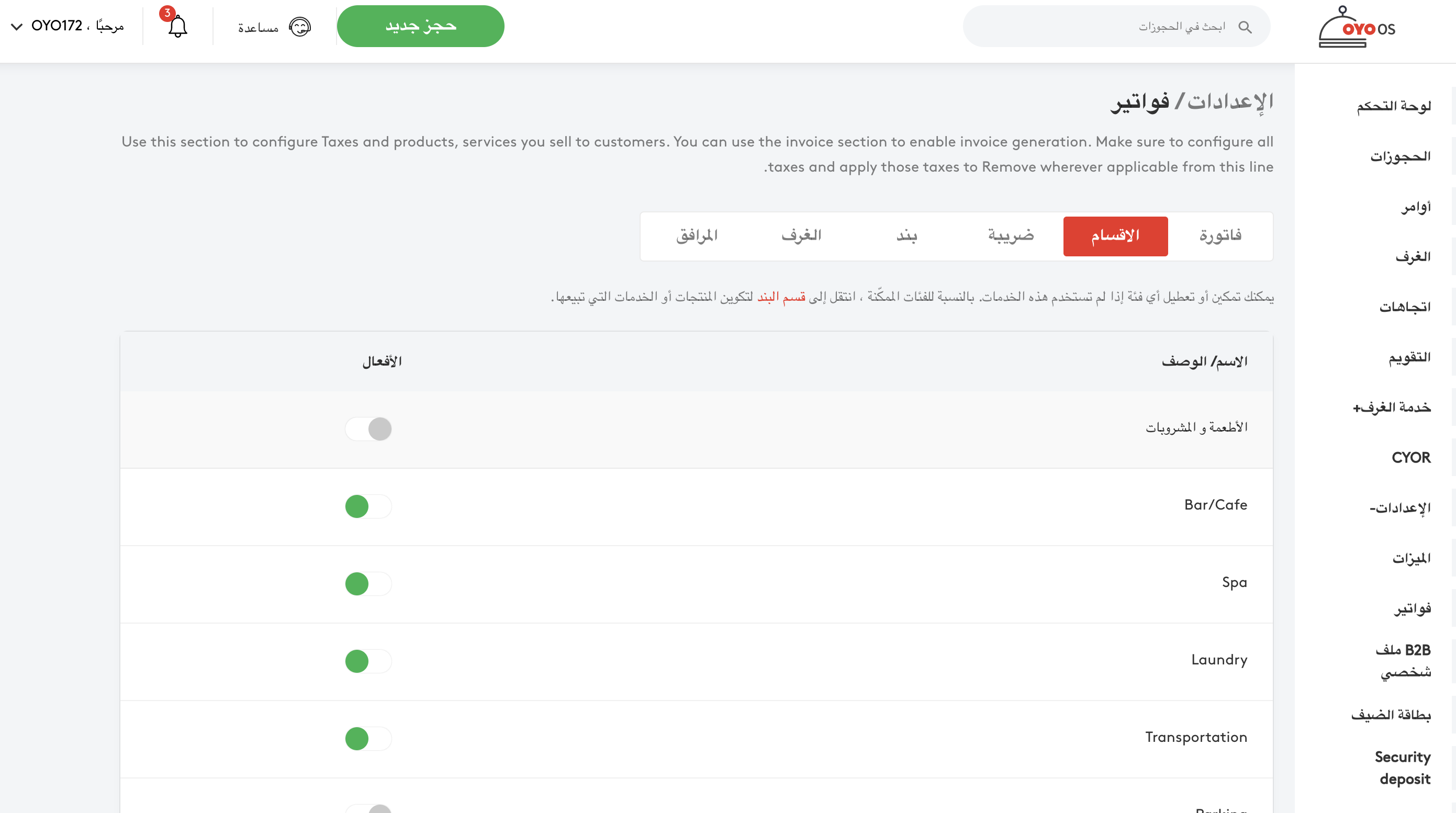 يمكن لمدير العقار تمكين أو تعطيل الفواتير لفئات الغرف حسب الحاجة من خلال إعدادت الفواتير من OYO OS .