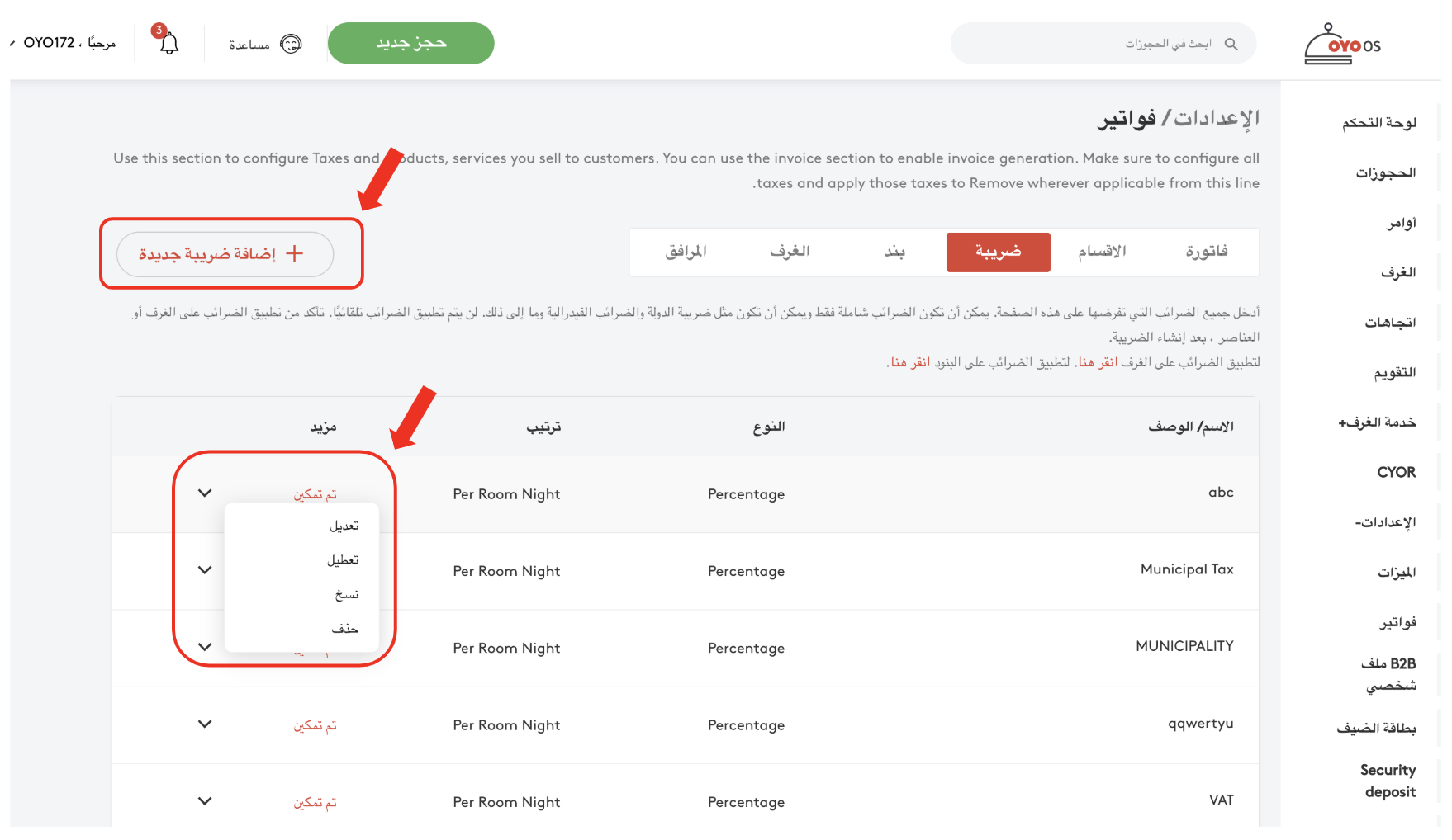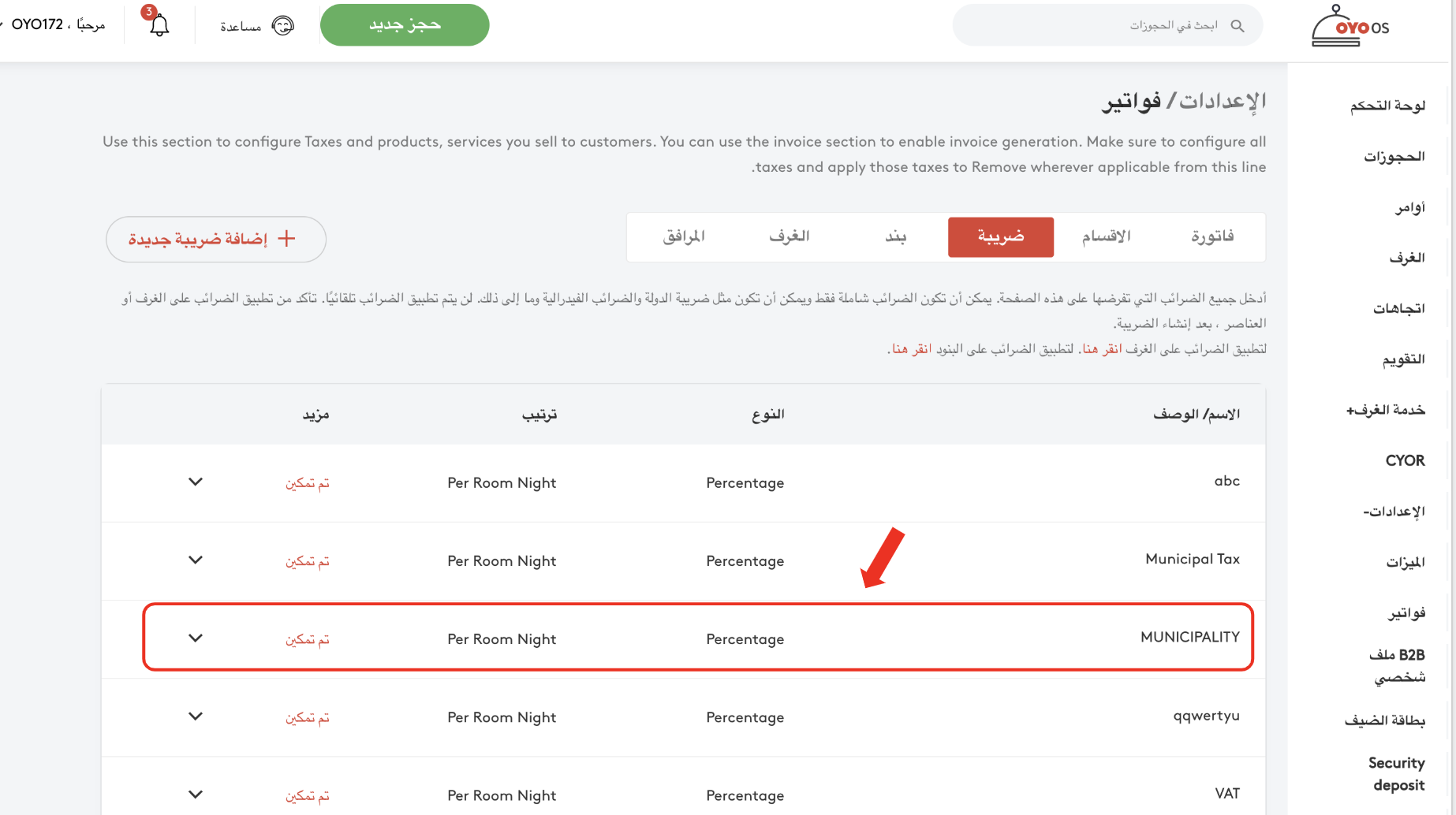 يمكن لمدير المنشأة إضافة أو تعديل أو حذف فئة معينة من الضرائب المطبقة وفقًا للقوانين المحكلية والتغييرات التي تحددها الهيئات المحلية من وقت لآخر.