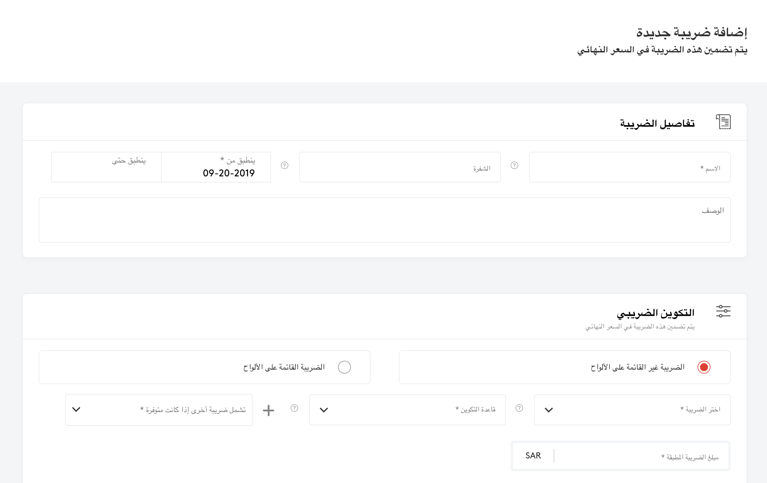 الخطوة 2: املأ أو حدّث تفاصيل الضريبة واسمها مع مدة تطبيق الضريبة في قسم التفاصيل الضريبية.