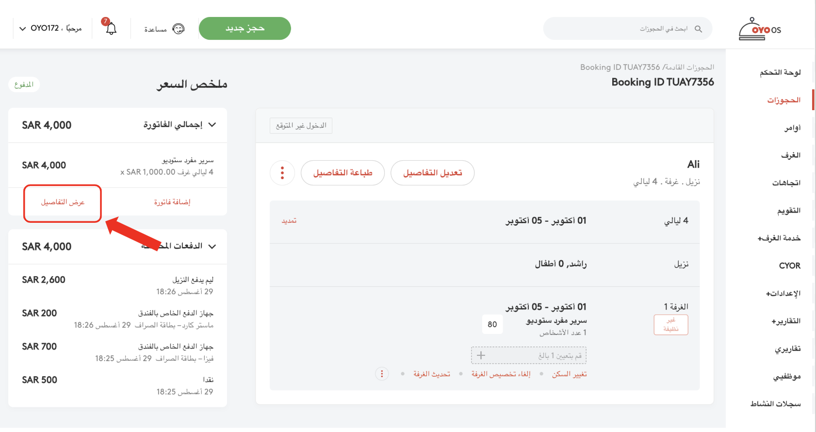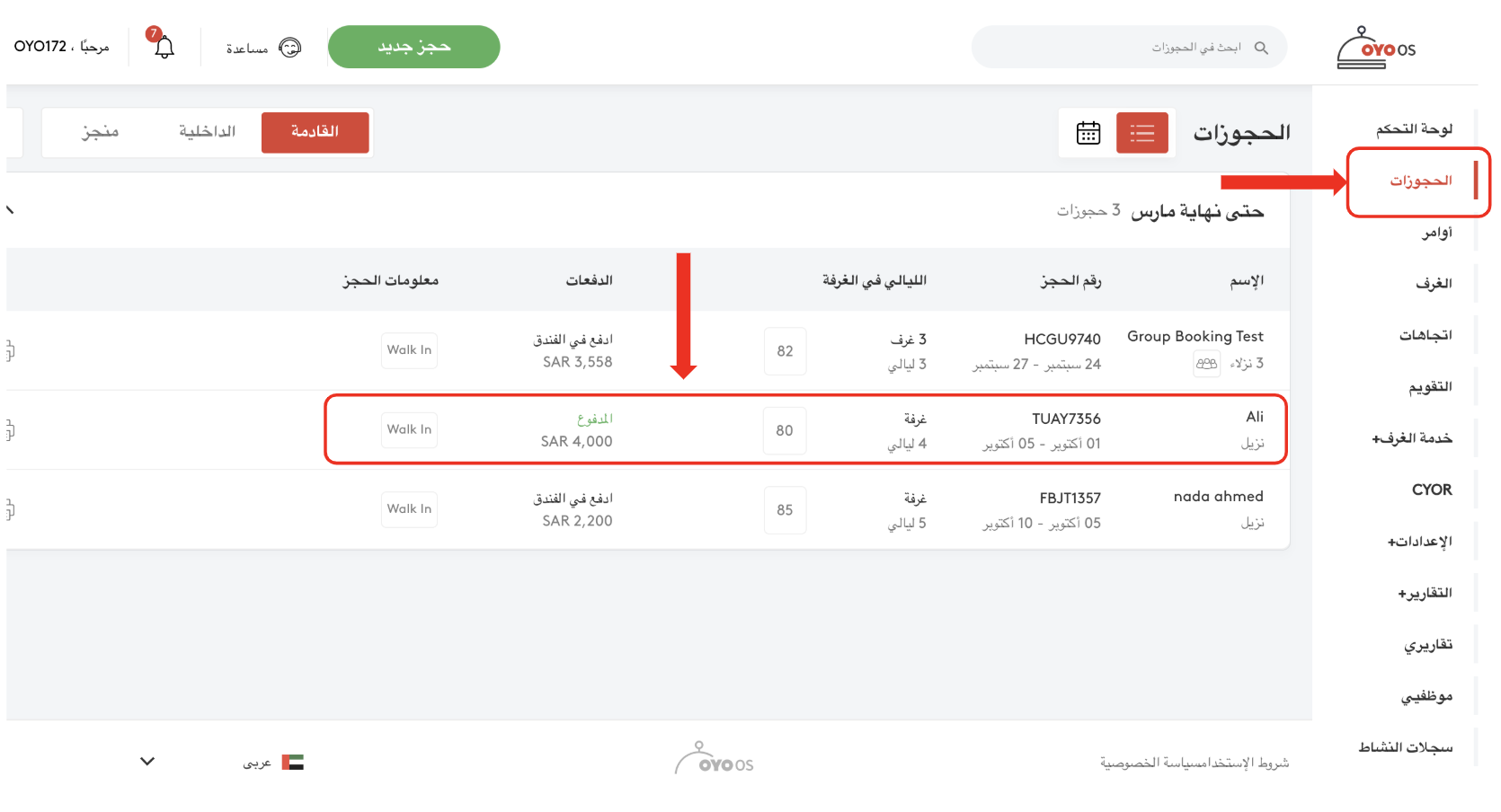 الخطوة 1: من علامة التبويب "الحجوزات"، انقر فوق الحجز الذي يجب إزالة فاتورة منه.