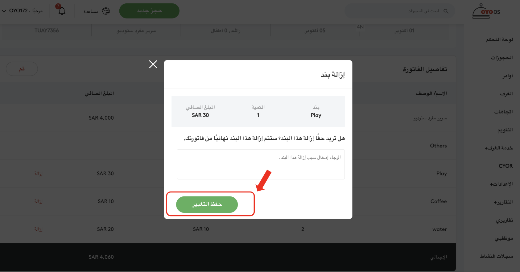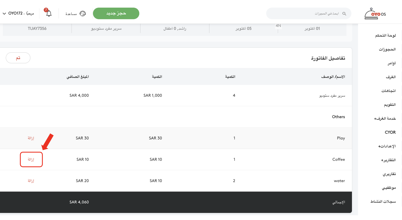 يمكن لمدير العقار إزالة فاتورة من الحجز الذي تمت إضافته مسبقًا باتباع الخطوات التالية: