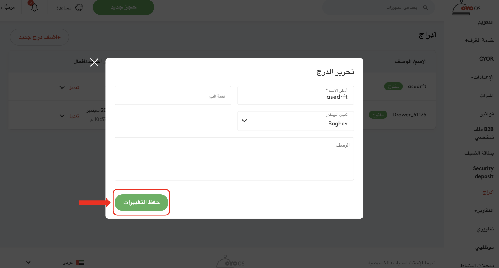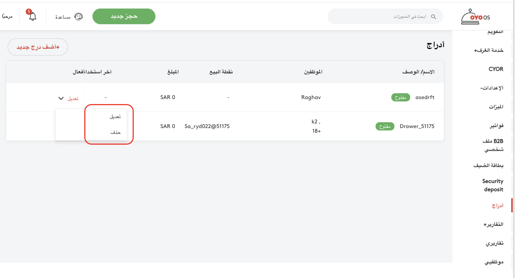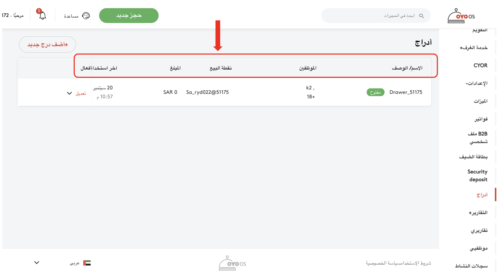 يمكن الآن لمدير العقار الاحتفاظ بعدة أدراج نقدية افتراضية في نقطة البيع ، وستمكن ميزة الأدراج مدير الممتلكات من تعيين أدراج نقدية لكل موظف يتعامل مع نقطة البيع. يمكن إنشاء أدراج متعددة من خلال نظام OYO OS، ويمكن تعديل الأدراج الحالية.