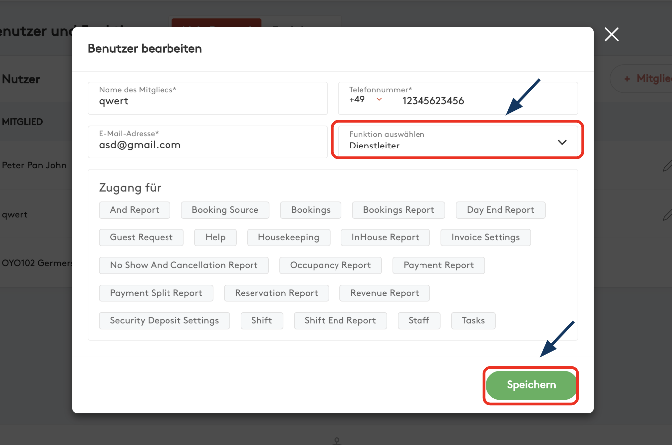 SCHRITT 3: Passen Sie die Mitarbeiterfunktion im separat geöffneten Fenster an und klicken Sie auf „Speichern“, um die Änderungen zu übernehmen. Sie erhalten die Mitteilung „Änderungen erfolgreich gespeichert“. Der entsprechende Mitarbeiter verfügt nun gemäß dem geänderten Benutzerprofil über die aktualisierten Zugriffsrechte auf das OYO OS.