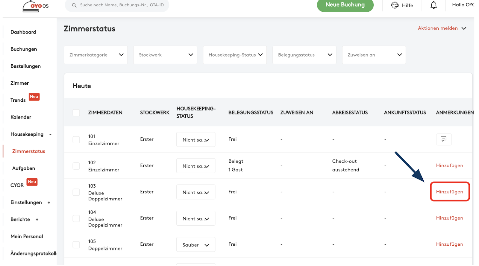 SCHRITT 3: Klicken Sie bei der Zimmernummer, zu der Sie einen besonderen Kommentar eingeben möchten, auf die Schaltfläche „Hinzufügen“.