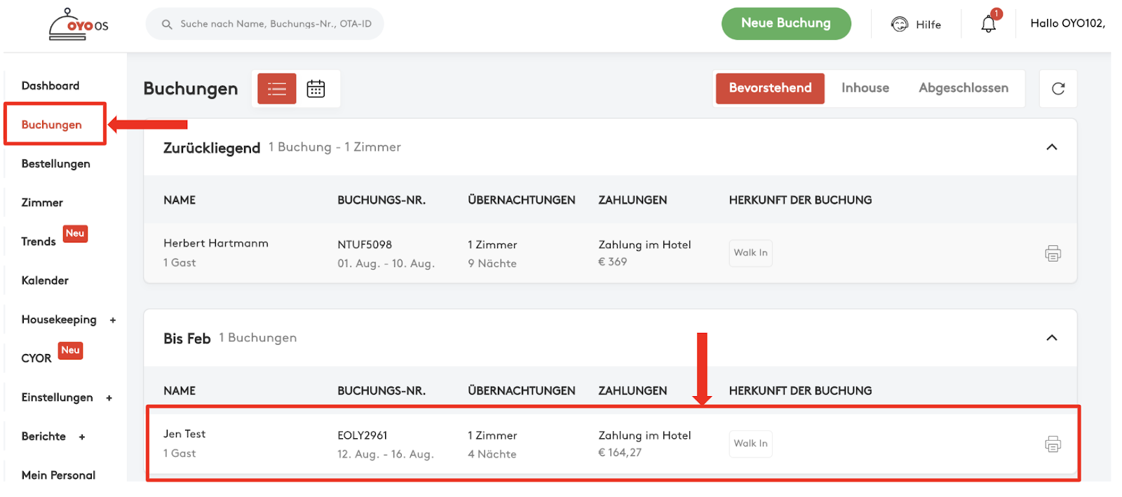 Schritt 1: Klicken Sie in der Registerkarte „Buchungen“ auf die Buchung, für die ein Rechnungsposten hinzugefügt werden soll.