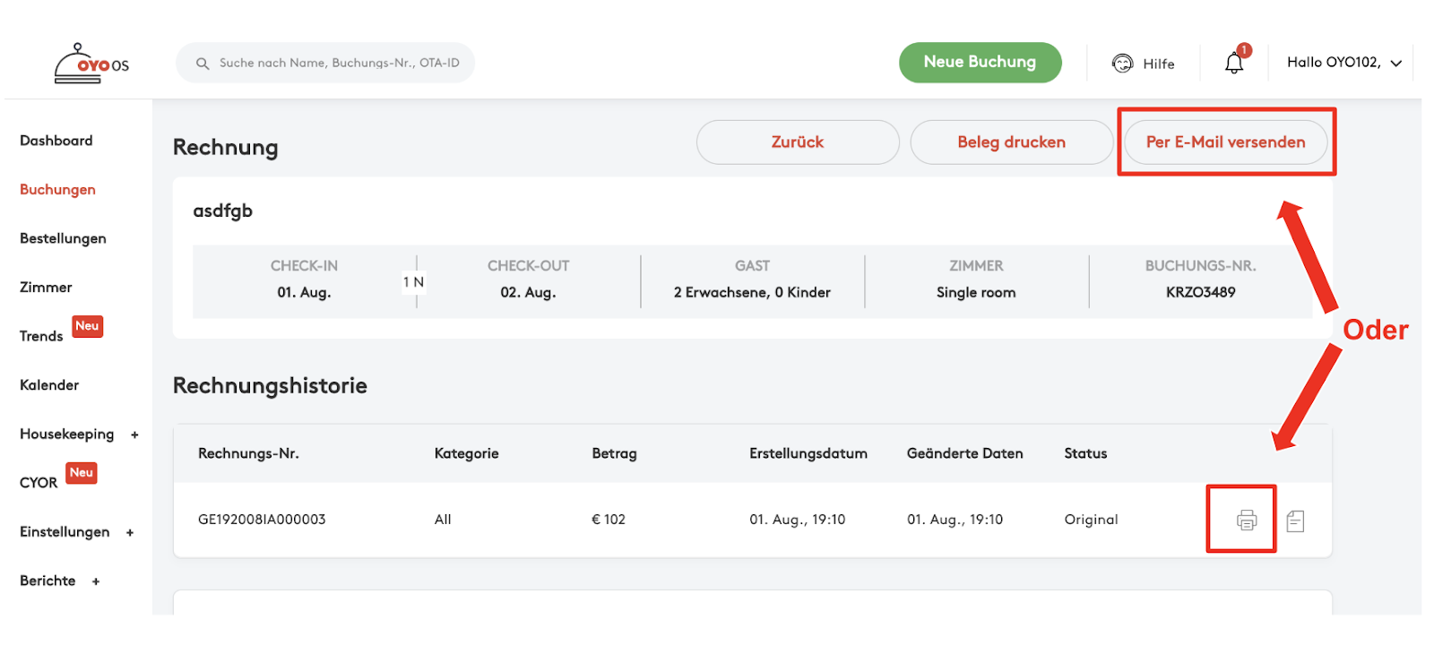 Schritt 3: Um die Rechnung per E-Mail direkt an den Gast zu senden, klicken Sie oben rechts auf die Schaltfläche „Rechnung per E-Mail senden“.