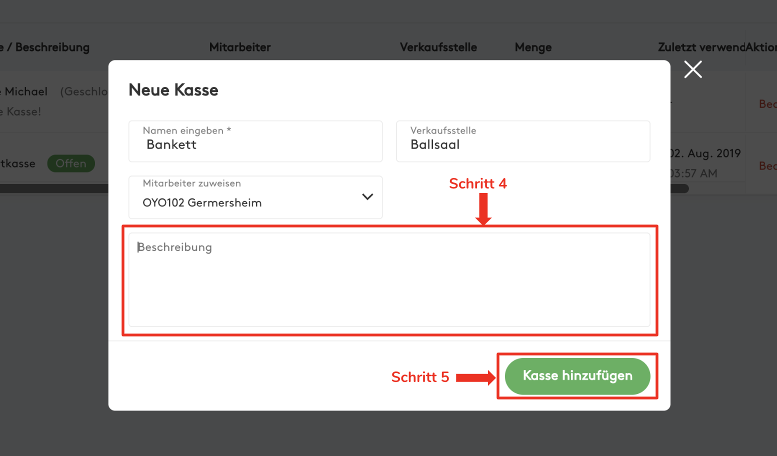 IV) Geben Sie eine Beschreibung der Kasse ein.