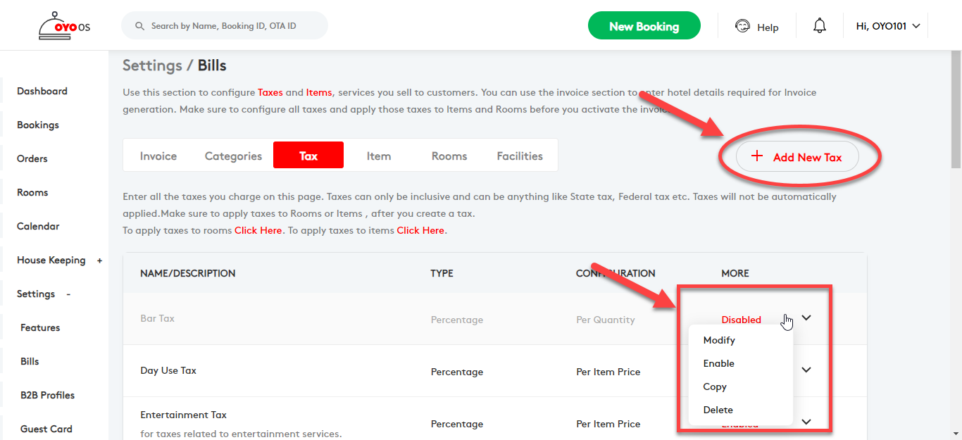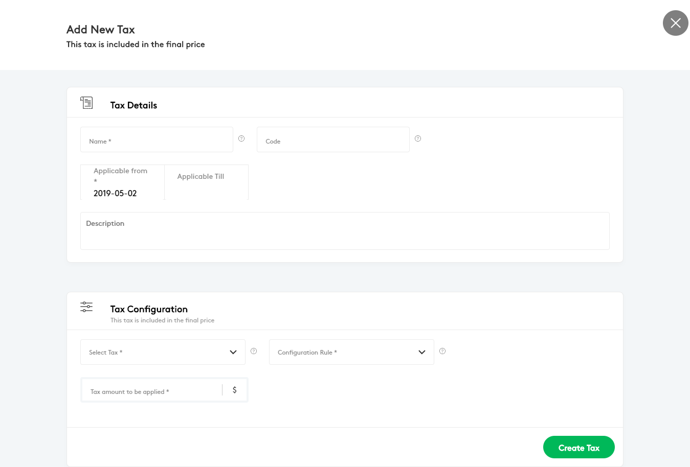 Step 1: Click on ‘add new tax’ to configure a new tax or hover over on the previous tax card and click ‘modify’ to update the same.