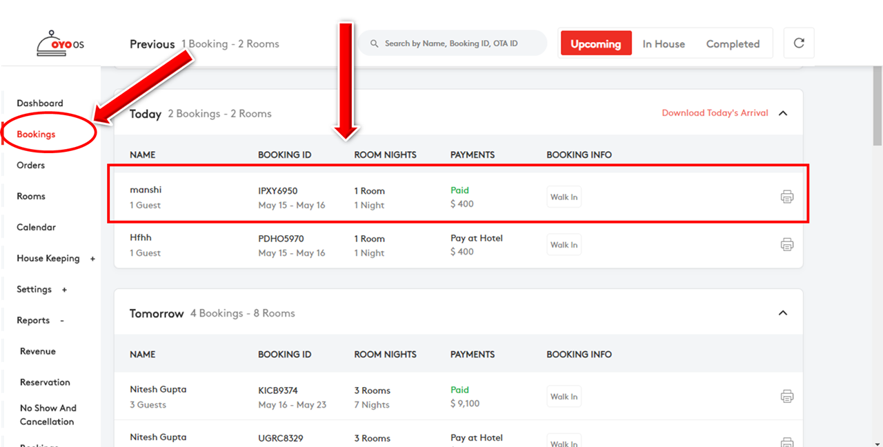 Step 1: From the bookings tab, click on the booking for which the security deposit needs to be added.
