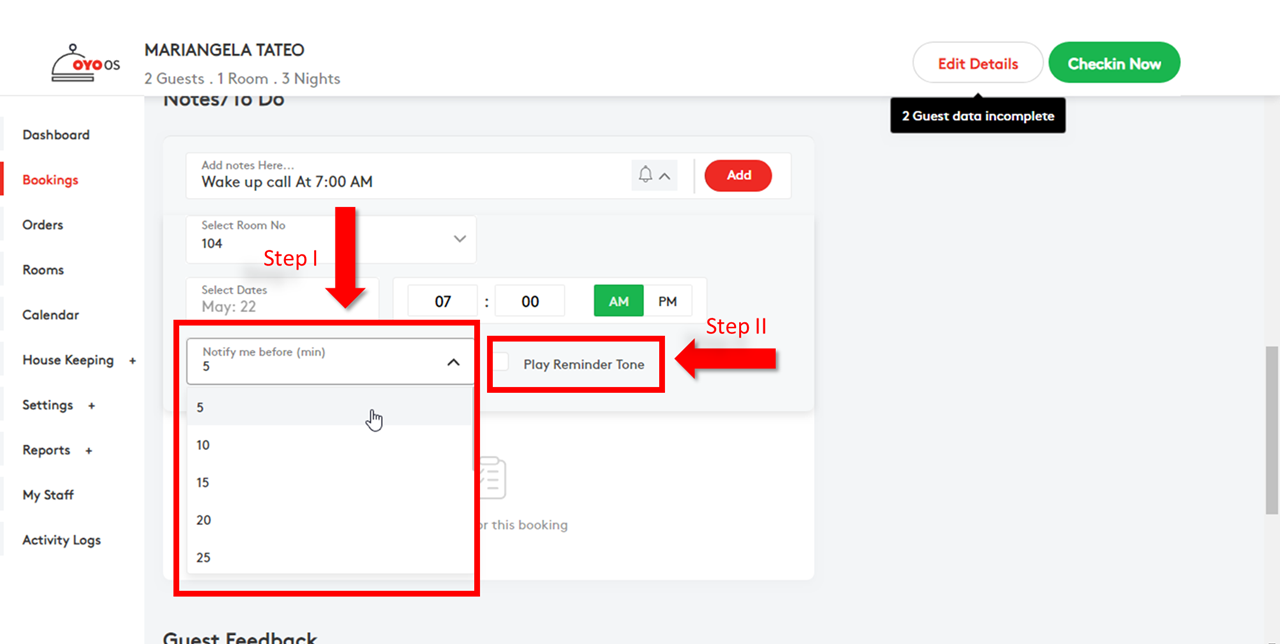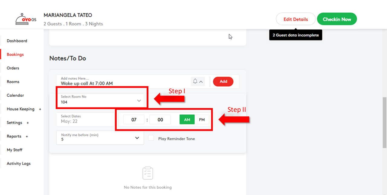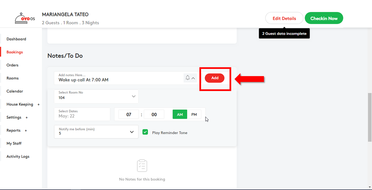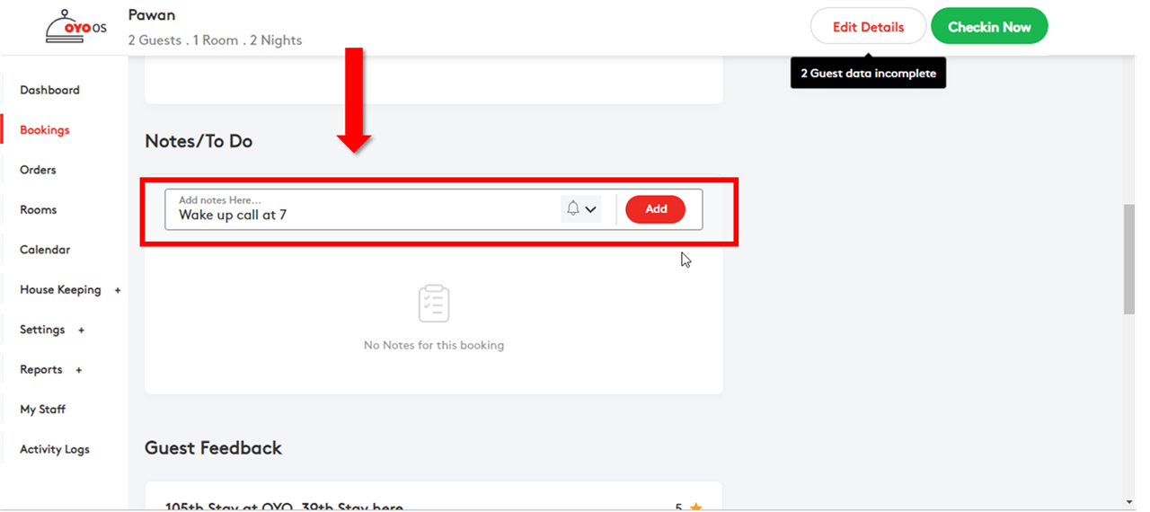 The property manager can now add reminders for tasks that a guest may ask for, reminders can be set to a booking on OYO OS by following the steps below: