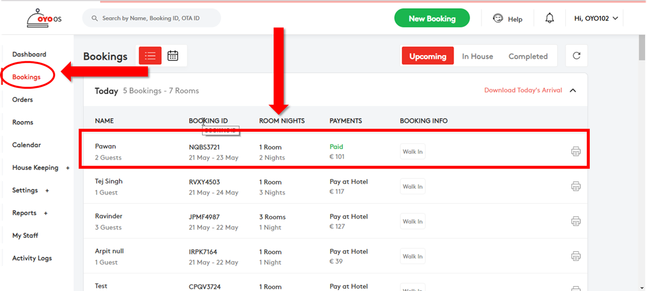 Step 1: From the homepage of the OYO OS navigate to the bookings screen and click on the booking for which a reminder needs to be set.