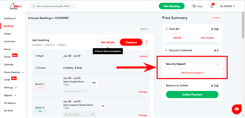 The property manager can add security deposits to a booking, which are to be collected from the guest at the time of check-in as an assurance from the guest.