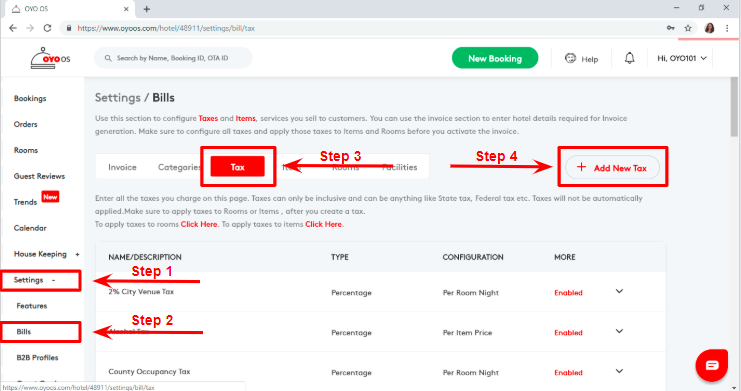 Step 4: After adding a tax, please enable the tax to start applying it on rooms and items.