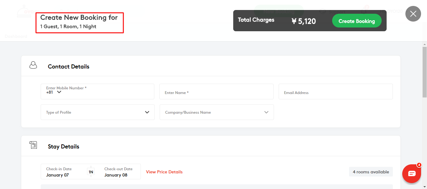 3. On this screen, enter booking details such as Contact Details, Stay Details,