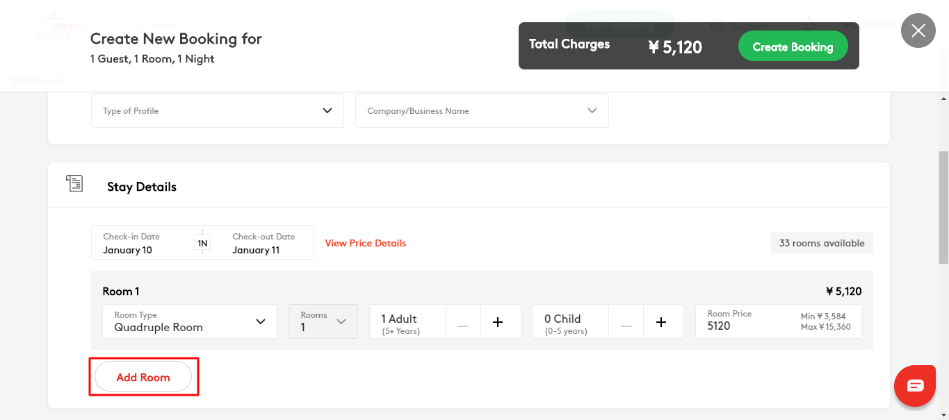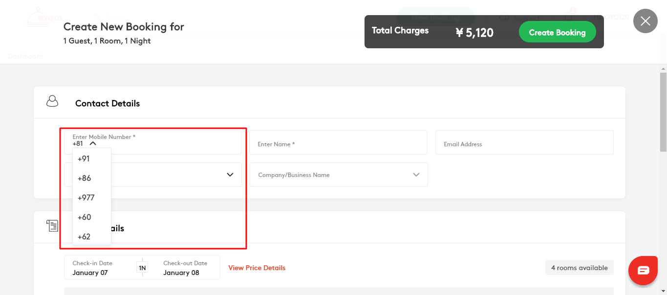 1. Click on the ‘New Booking’ button always accessible from any OYO OS screen.