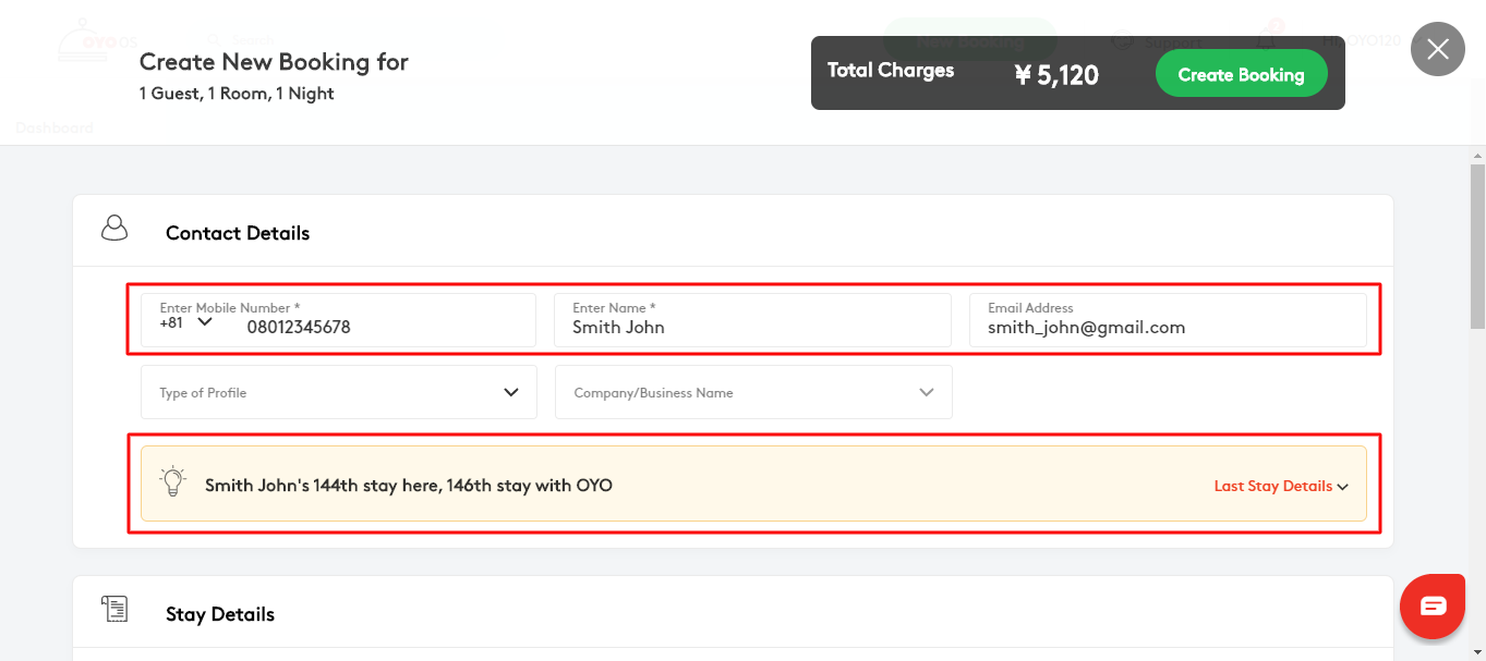 - If the customer has been registered with OYO OS earlier, guest details and last stay details will be automatically fetched from the system. Refer to the image below.