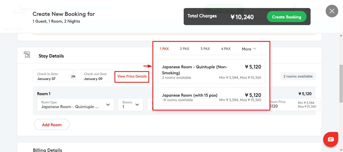 7. Click on ‘View Price Details’ and check the price for available rooms.