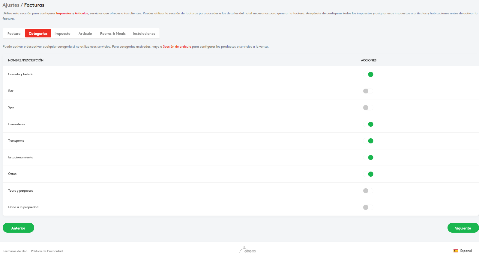 El administrador de la propiedad puede habilitar o deshabilitar las categorías para las cuales la facturación debe realizarse desde el sistema operativo OYO al cambiar las alternaciones frente a cada categoría.