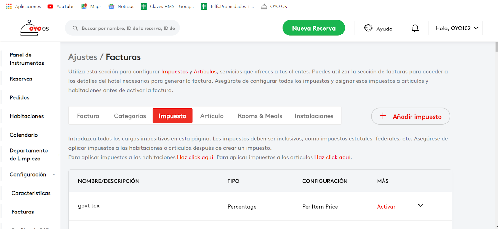 Asegúrese de que el impuesto que desea aplicar esté en el estado "habilitado"; de lo contrario, el mismo no se aplicará al imprimir las facturas.