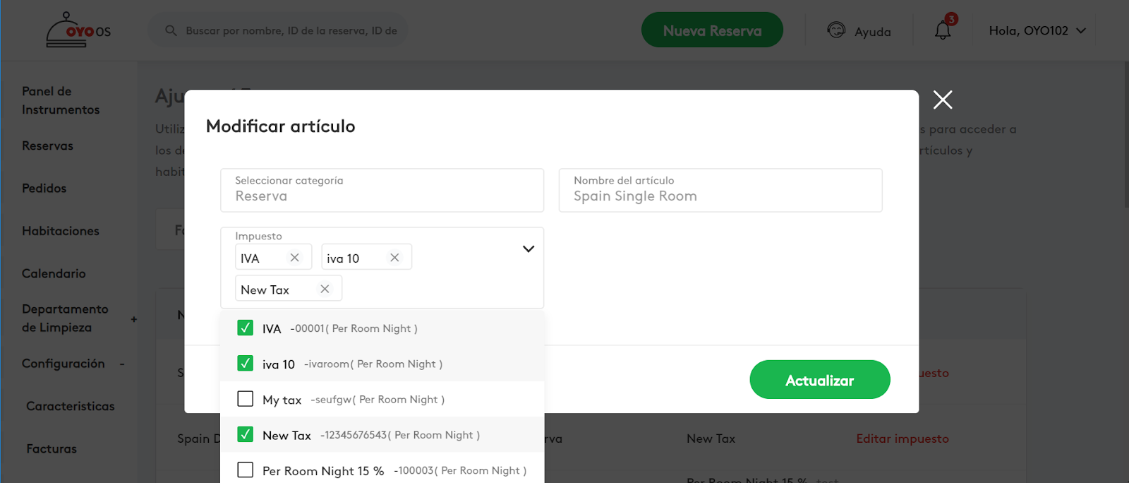 Paso 2: Seleccione los impuestos aplicables (uno o múltiples) del menú desplegable que se aplican para la categoría de habitación.