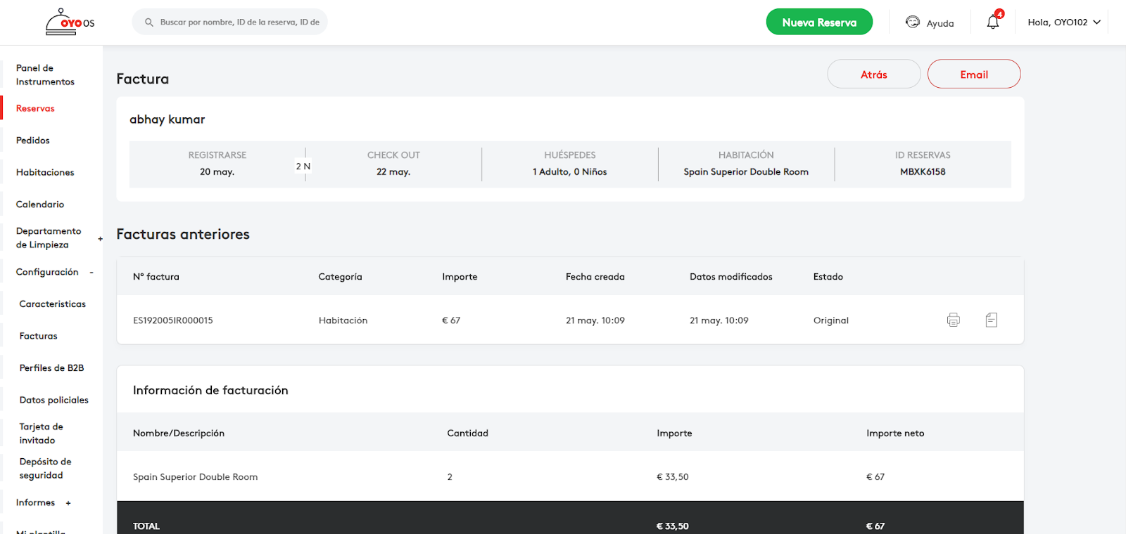 Factura proforma: se genera una factura proforma antes de la salida, esto se hace para proporcionar al huésped una factura para obtener una confirmación de los detalles de la factura (función disponible solo en determinadas geografías)