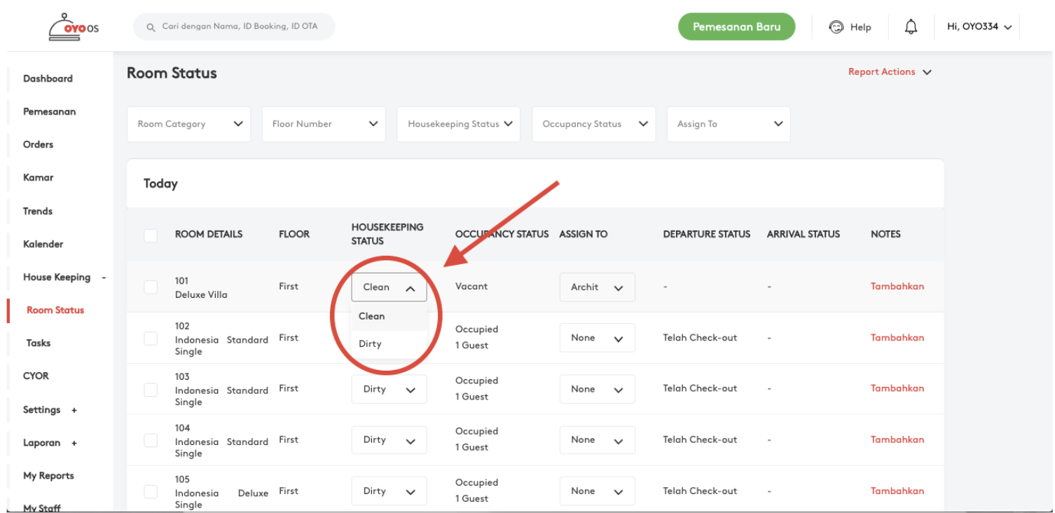 LANGKAH 3: Di bawah judul “Housekeeping Status” klik menu drop down dan pilih status ruangan.