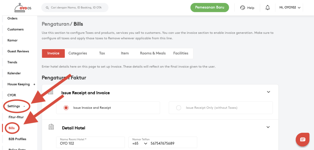 Manajer properti dapat menambahkan tagihan dari setiap barang / layanan yang ditawarkan di hotel OYO mereka dan mencetak Faktur dengan mengklik tombol melalui OYO OS. Agar dapat memanfaatkan fungsionalitasnya, faktur pertama harus dikonfigurasi pada login OS OYO properti.