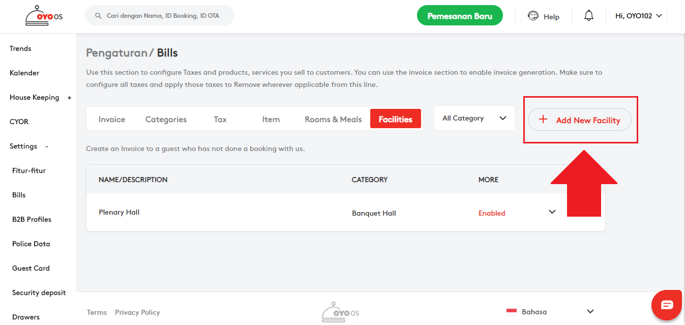Langkah 3: Klik pada ‘add new facilities' untuk menambahkan fasilitas yang disediakan oleh properti kepada tamu yang tidak menginap yang mengunjungi properti.