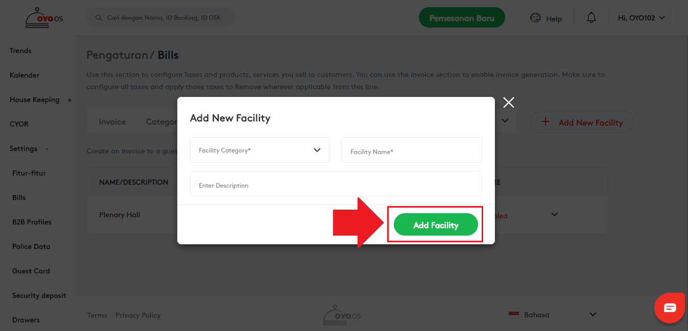 Langkah 3: Klik pada ‘add new facilities' untuk menambahkan fasilitas yang disediakan oleh properti kepada tamu yang tidak menginap yang mengunjungi properti.