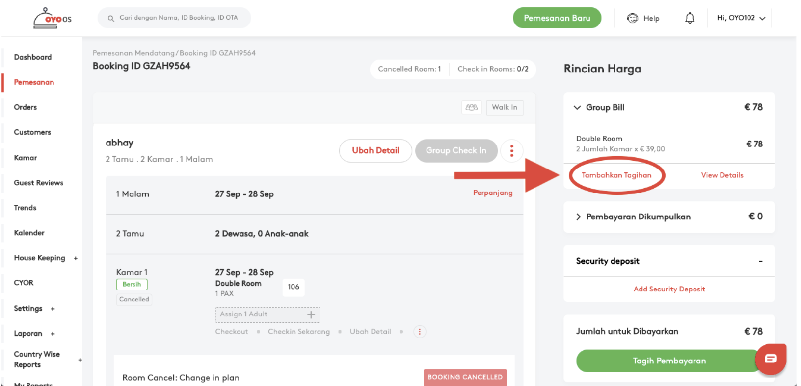 Manajer properti dapat menambahkan tagihan pada pemesanan untuk layanan apa pun atau pemesanan yang disediakan oleh hotel melalui OYO OS. Menambahkan tagihan akan secara otomatis memperhitungkan pajak yang dikonfigurasi untuk layanan atau produk.