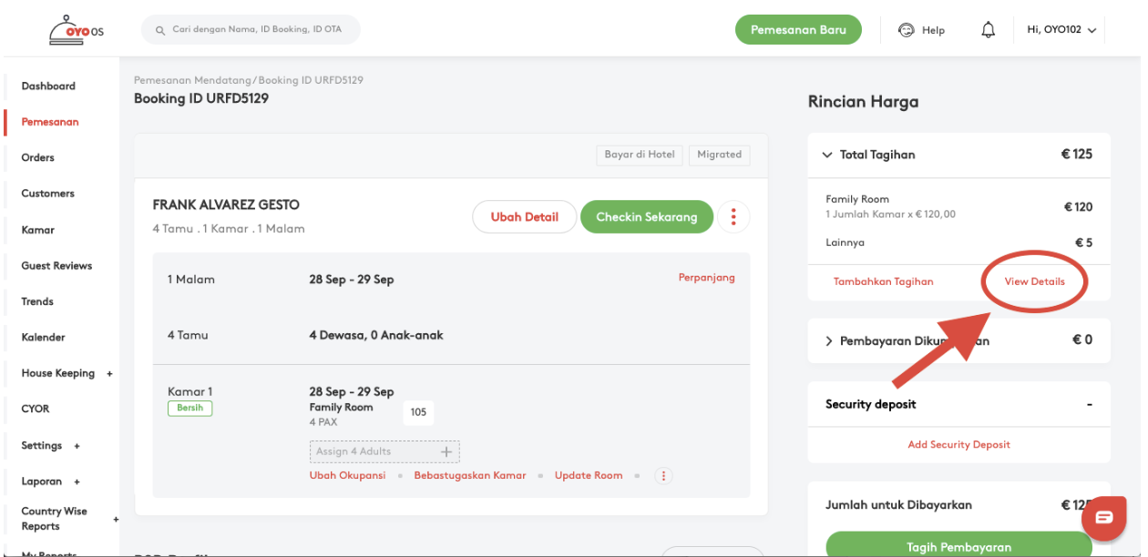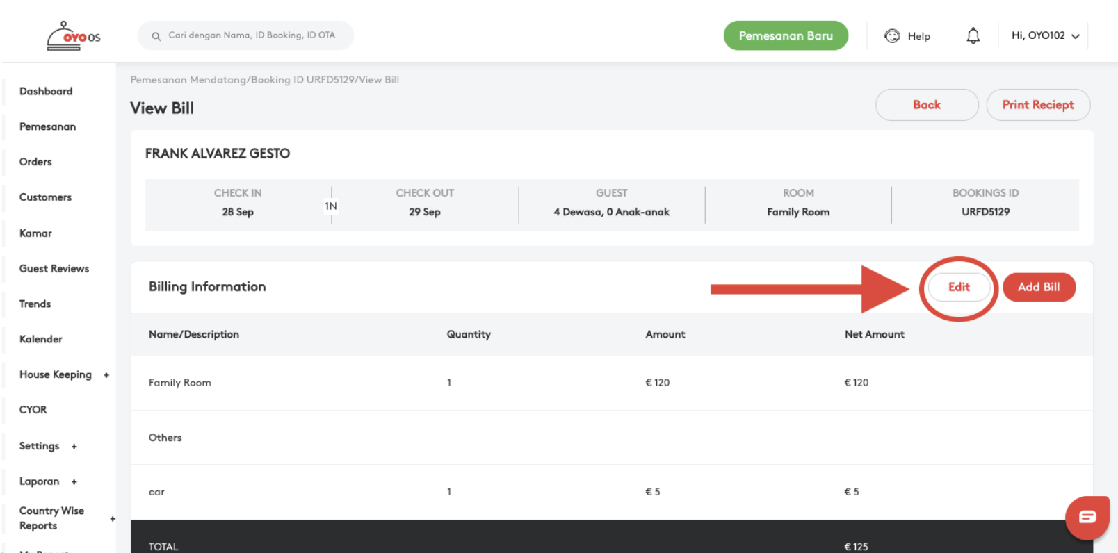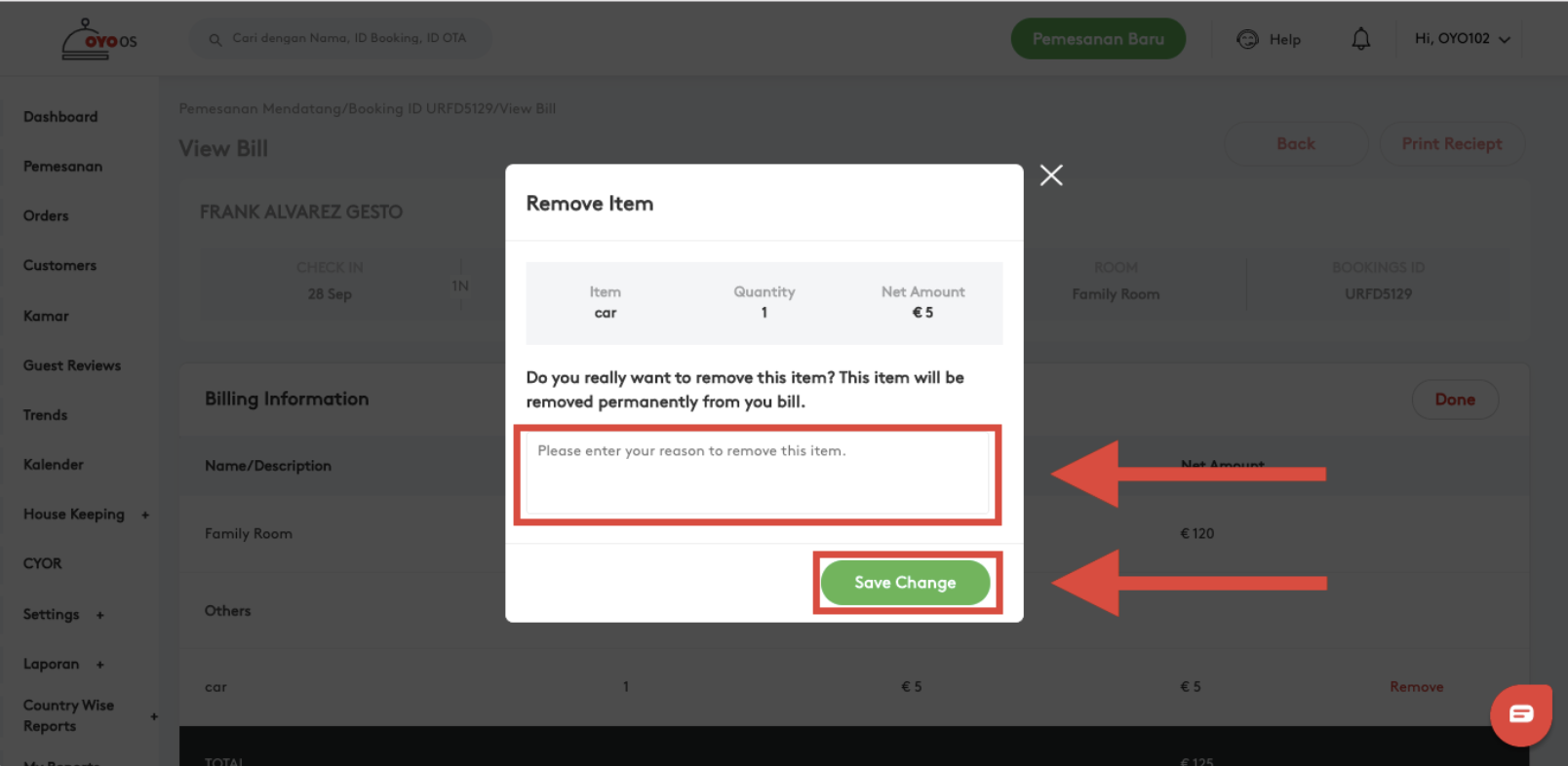 Manajer properti dapat menghapus tagihan dari pemesanan yang ditambahkan sebelumnya dengan mengikuti langkah-langkah di bawah ini: