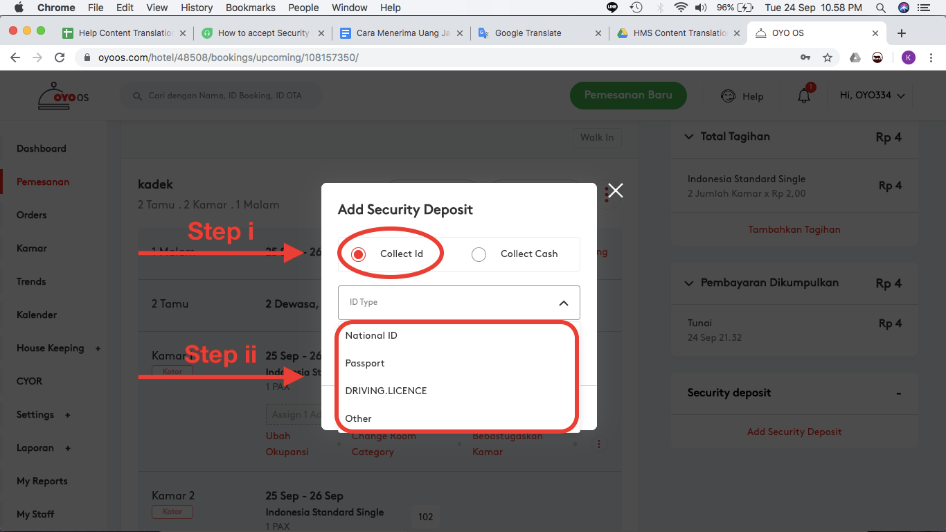 Langkah 3: Ada 2 jenis uang jaminan, 1) Setoran ID, 2) Setoran uang. Salah satu dapat diambil sebagai deposit, untuk dikembalikan pada saat check out.
