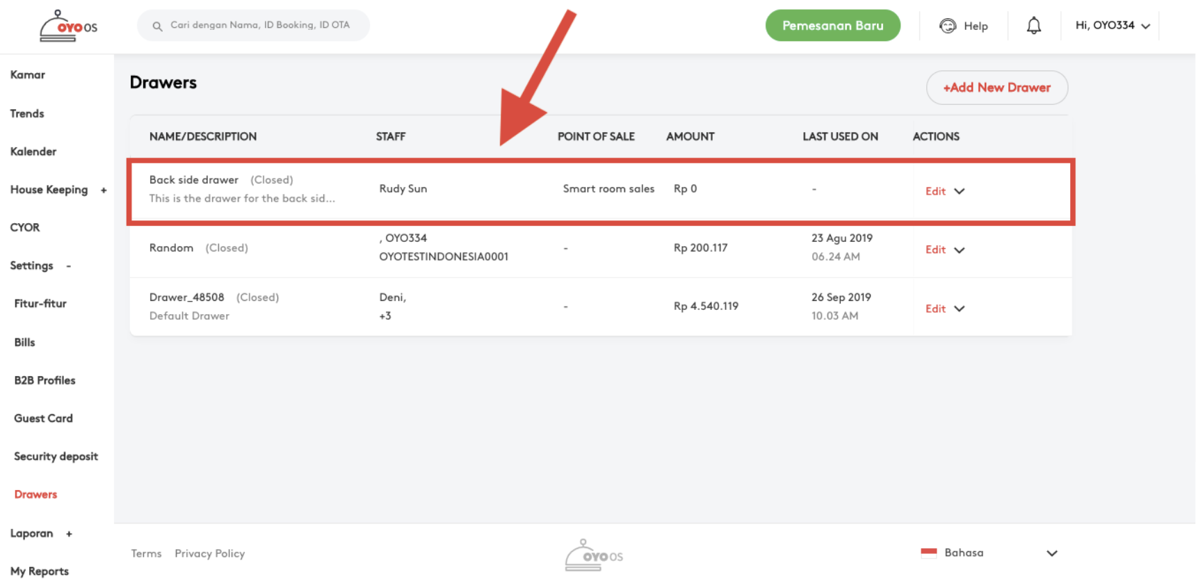 Manajer properti sekarang dapat mengelola beberapa Cash Drawer virtual di Point Of Sale, fitur Drawer akan memungkinkan manajer properti untuk menetapkan cash drawer untuk setiap karyawan yang berurusan dengan titik penjualan. Beberapa laci dapat dibuat melalui OYO OS, dan drawer yang ada dapat diedit.