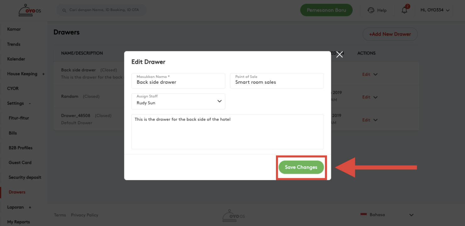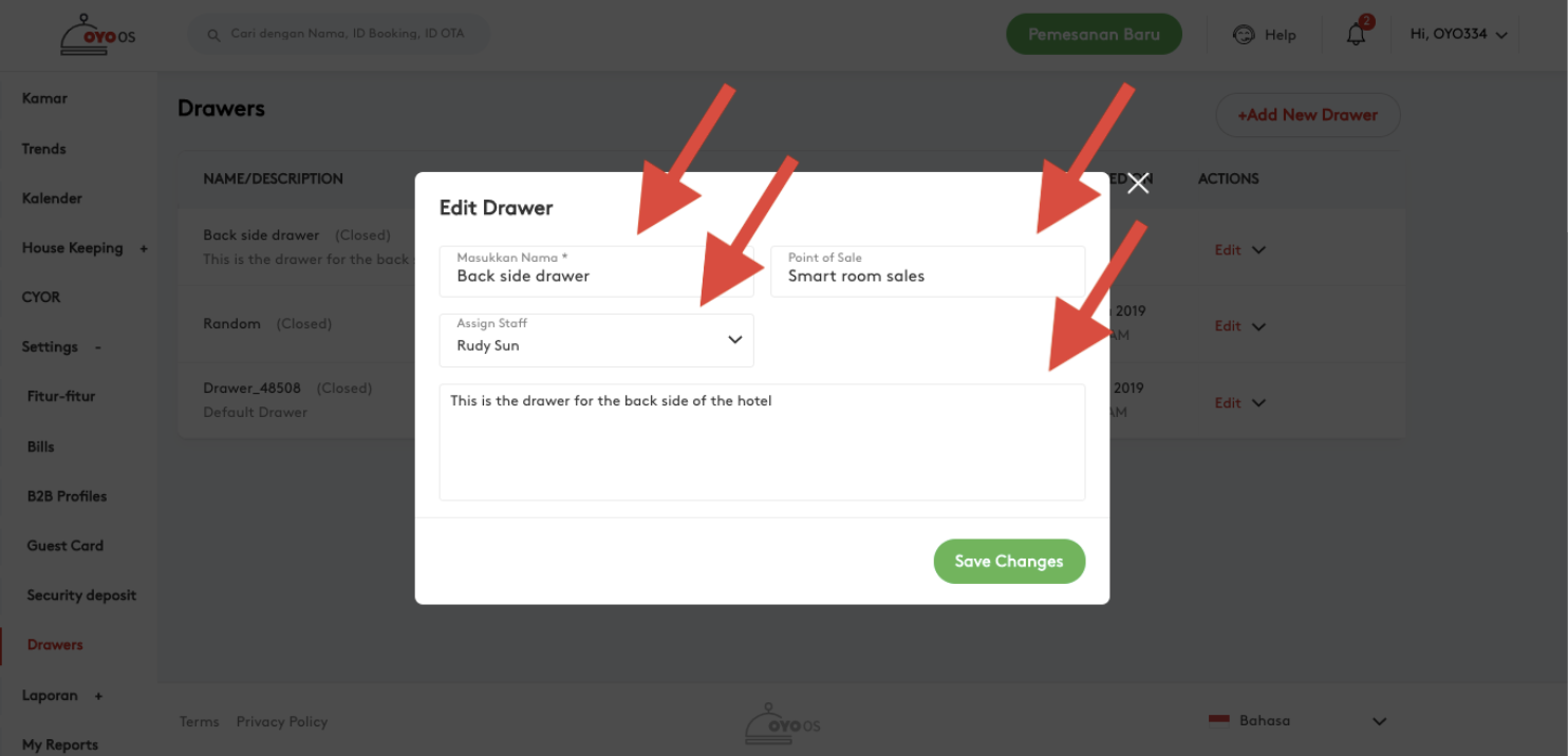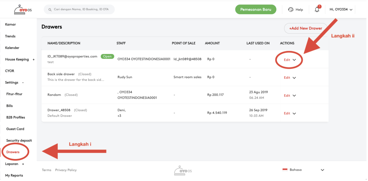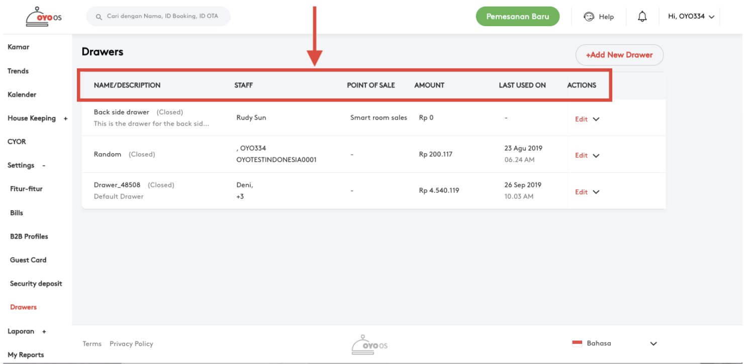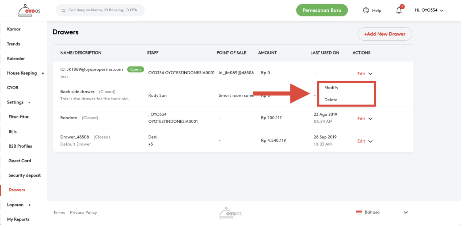 Manajer properti sekarang dapat mengelola beberapa Cash Drawer virtual di Point Of Sale, fitur Drawer akan memungkinkan manajer properti untuk menetapkan cash drawer untuk setiap karyawan yang berurusan dengan titik penjualan. Beberapa laci dapat dibuat melalui OYO OS, dan drawer yang ada dapat diedit.