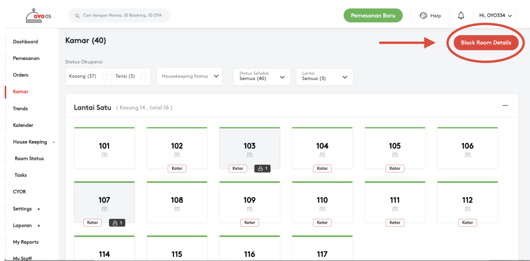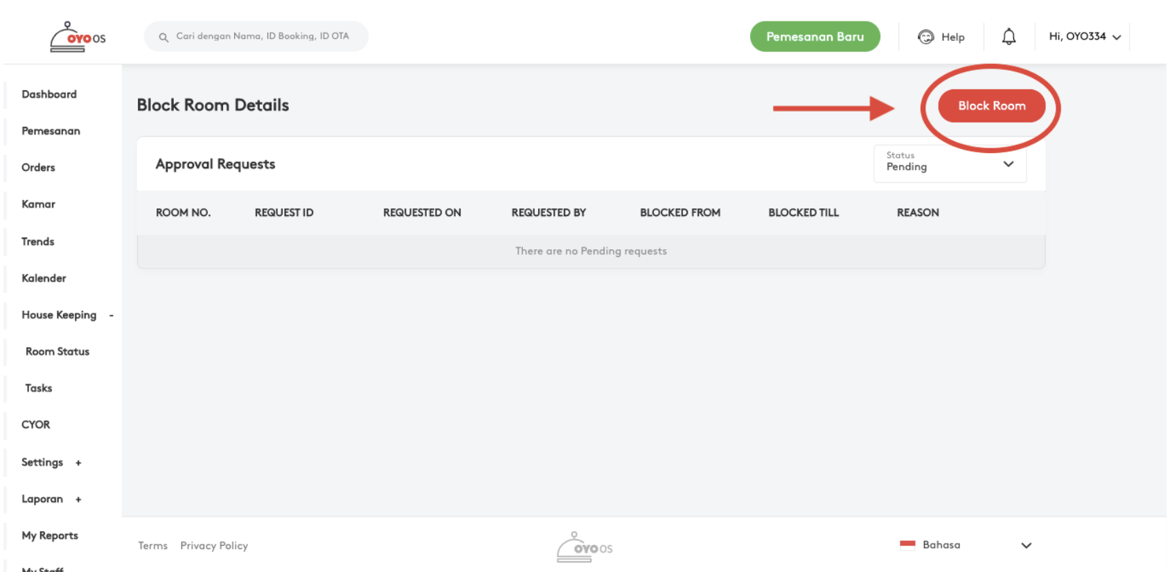 Manajer properti dapat memblokir dan membuka blokir kamar menggunakan OYO OS. Blokir adalah ruangan yang tidak tersedia untuk dijual karena kondisi fisiknya; yang berkaitan dengan perbaikan dan pemeliharaan atau kesalahan dalam infrastruktur ruangan.