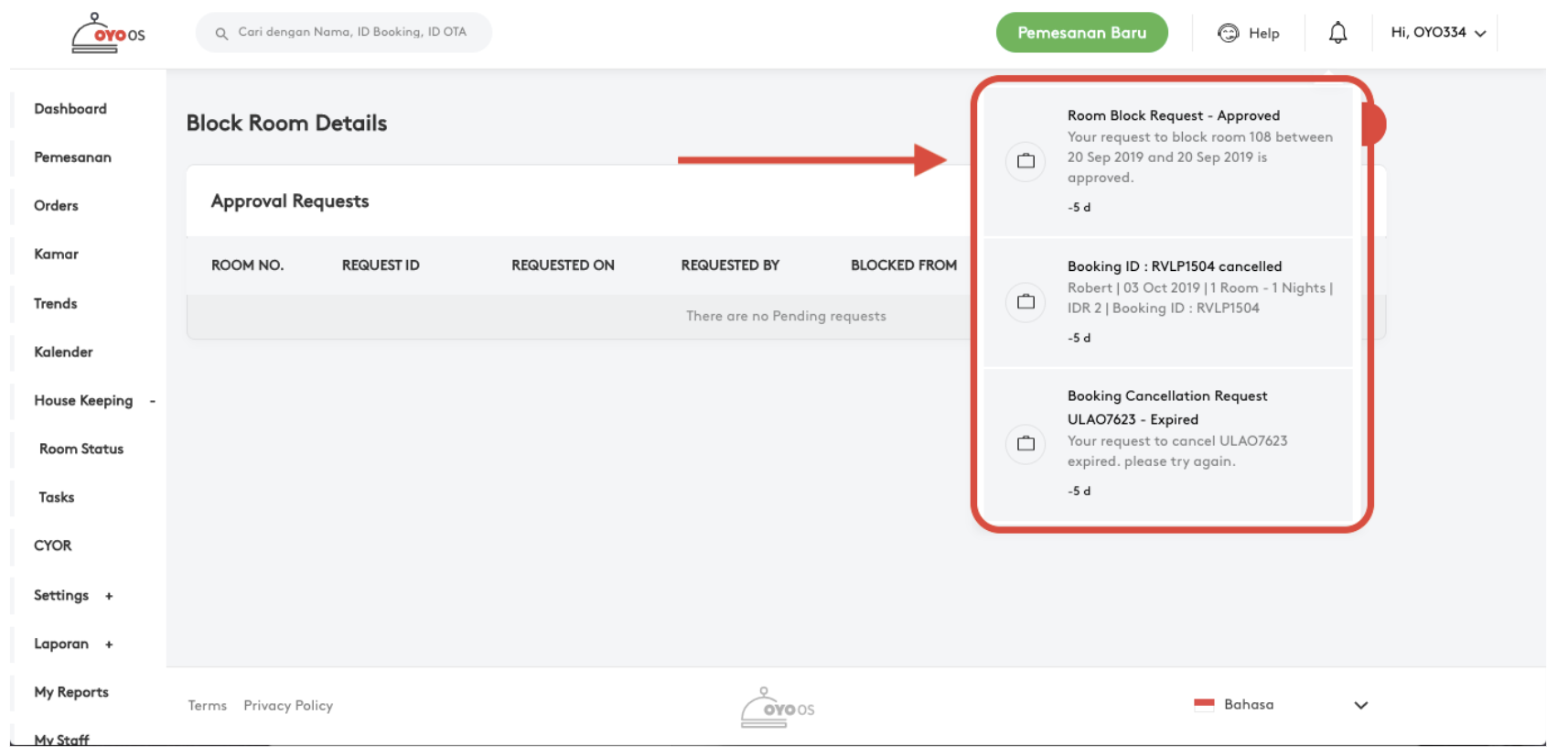 Langkah 5: Setelah Captain / AGM / Ops Manager menyetujui atau menolak permintaan pemblokiran, pemberitahuan akan muncul di OYO OS.