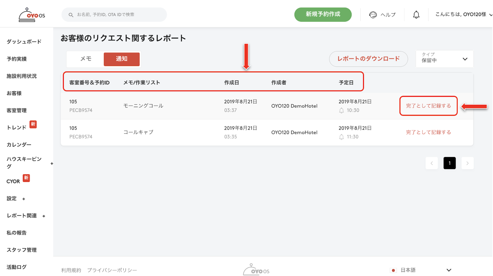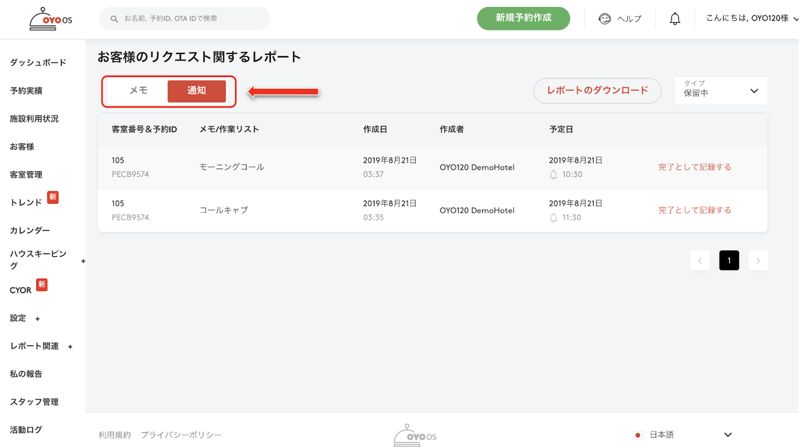当日の予約分 (到着済、今後到着する宿泊客の)Notes/Reminders が見られます。