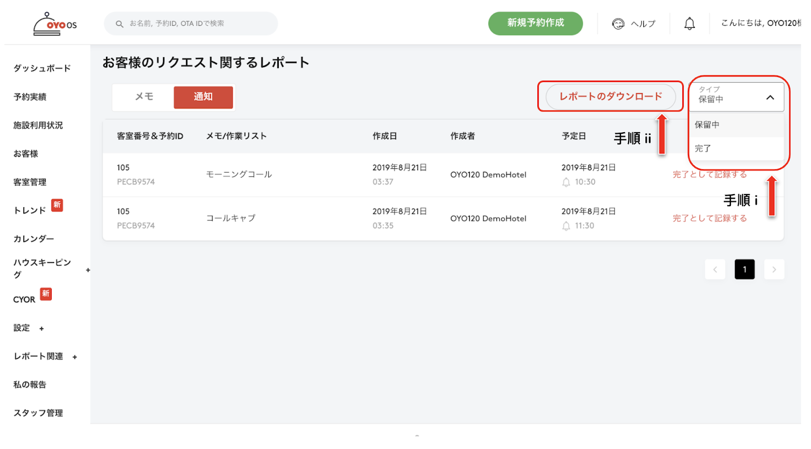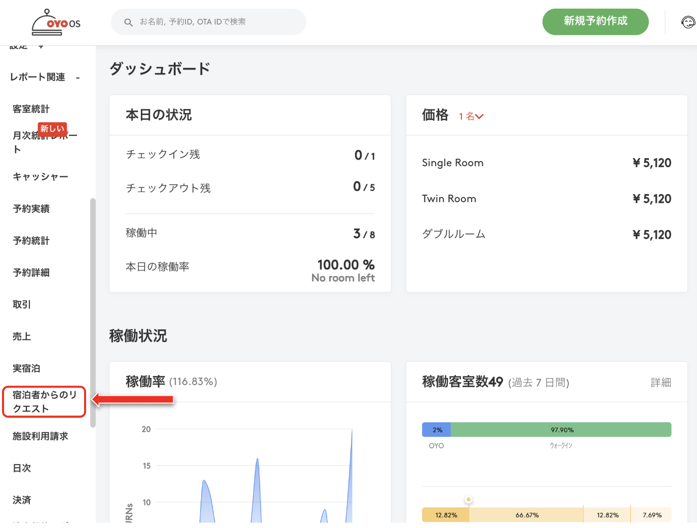 宿泊施設のマネージャーは以下の手順で宿泊客の要望一覧にアクセスできます。: