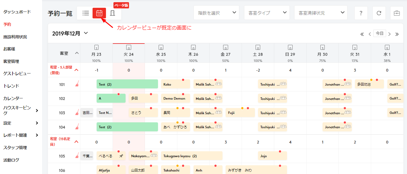 リストビュー、カレンダービュー、客室ビューごとの予約の表示・管理