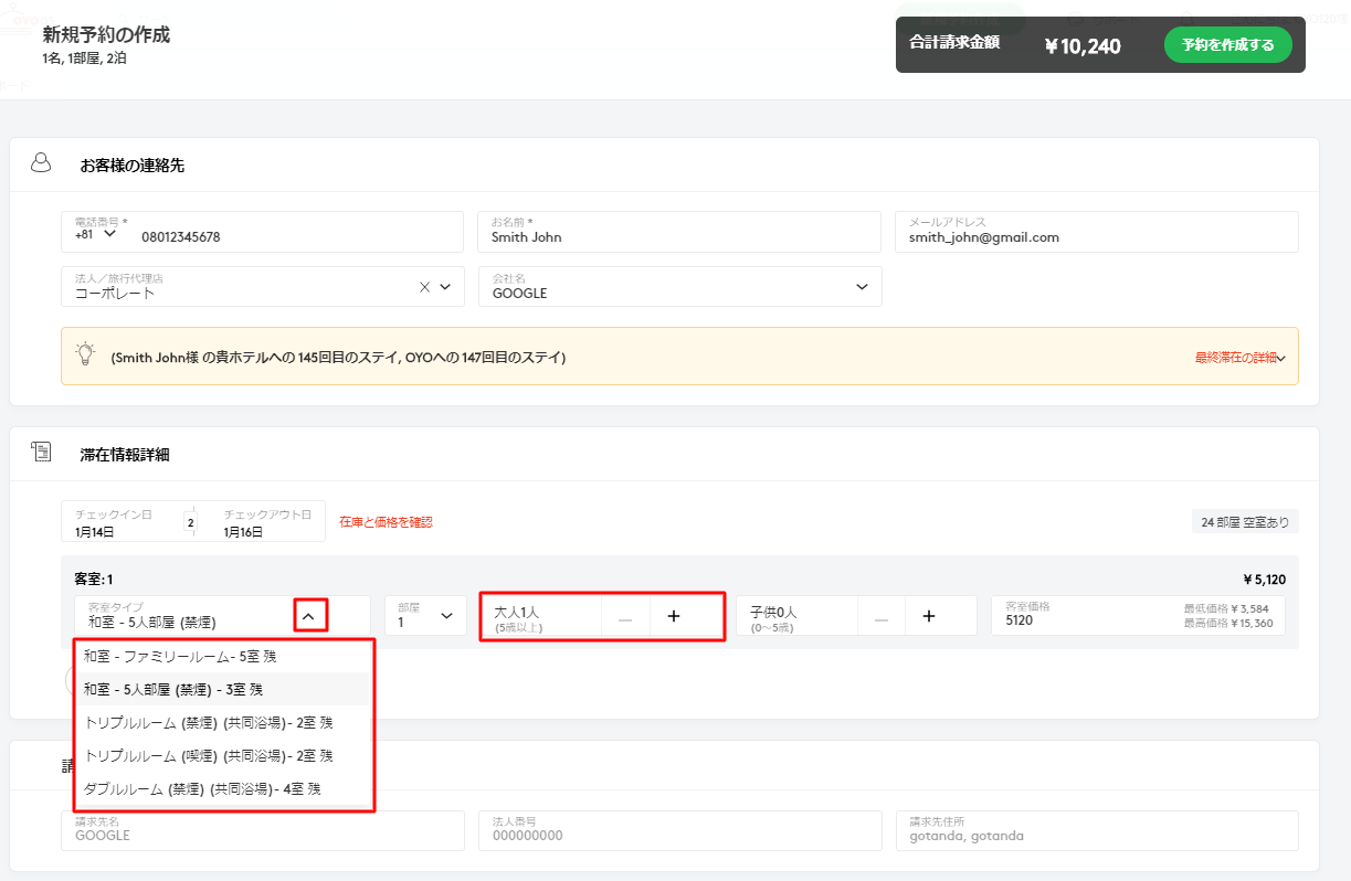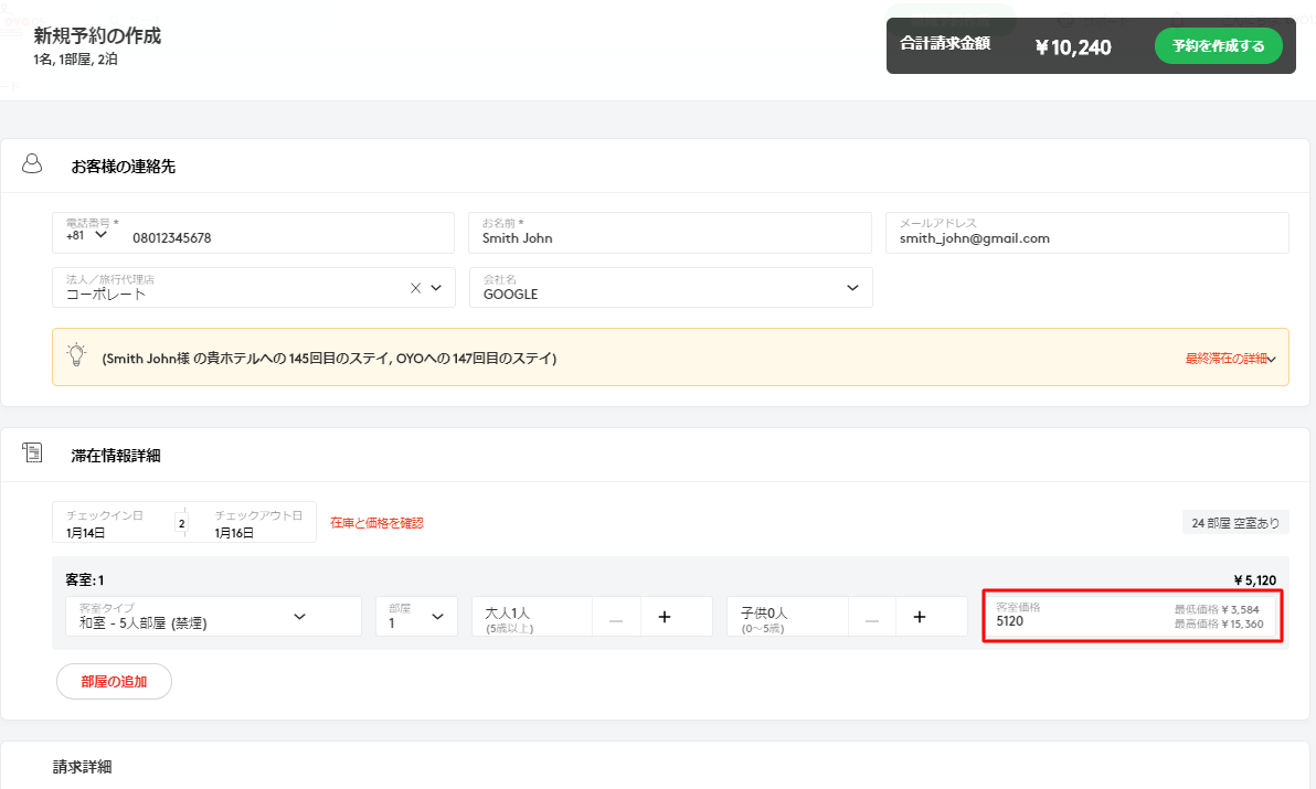 この画面で、お客様の連絡先、滞在情報詳細、請求詳細、およびメモ(ある場合)などの予約内容を入力してください。