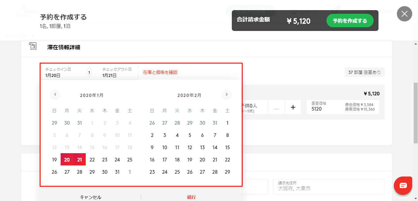 [予約を作成する]画面右上に表示されている、部屋の[合計請求金額]を確認してください。
