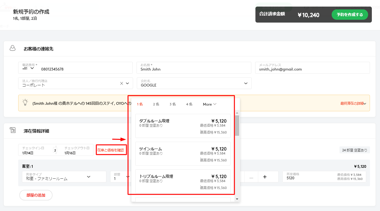 選択した宿泊人数に応じて表示される、その部屋の最低および最高価格のことです。 価格の決定権はOYOにありますが、貴施設様で変更されたい場合は、パートナーサポート経由でOYOにご連絡いただくか、または担当CAに連絡してください。