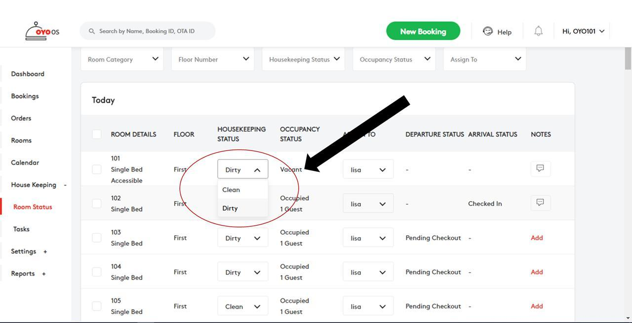 Passo 3: Sob o cabeçalho, o " Status Housekeeping" (status de serviço de limpeza), clique no menu suspenso e escolha o status do quarto