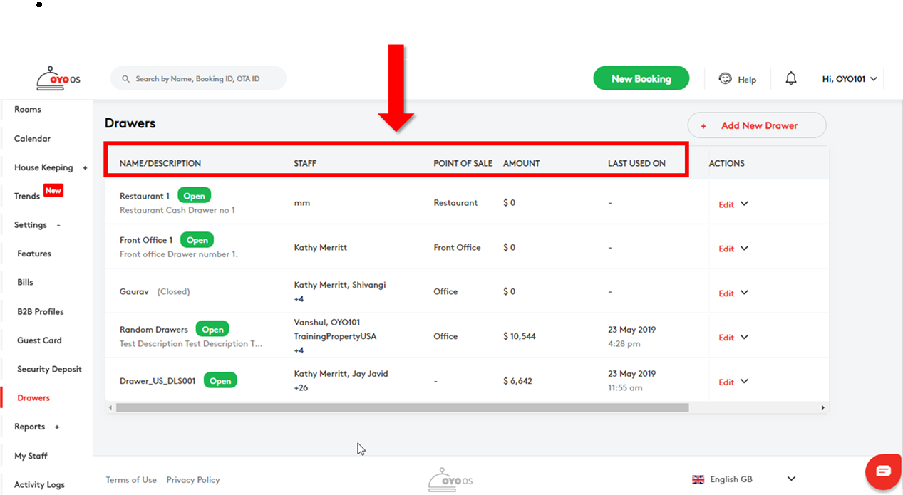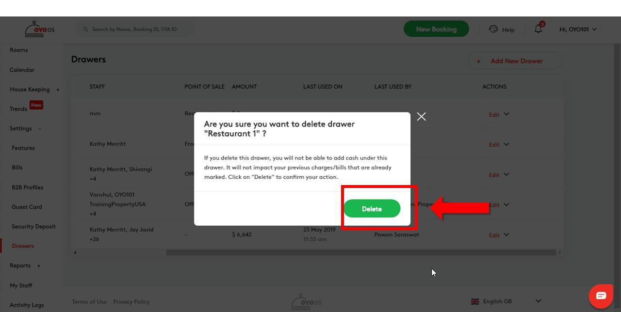 O gestor do estabelecimento pode agora manter várias gavetas de dinheiro virtuais no Ponto de Venda, o recurso "Drawers" (Gavetas) permitirá que o gestor atribua gavetas de dinheiro a cada funcionário que lidar com o ponto de venda. Múltiplas gavetas de dinheiro podem ser criadas através do sistema OYO OS e podem ser editadas. O recurso de gavetas rastreia os seguintes dados: