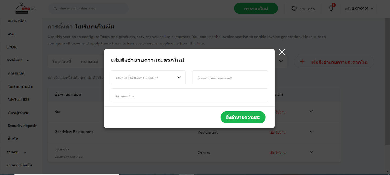 OYO OS มีฟังก์ชั่นการพิมพ์ใบแจ้งหนี้สำหรับลูกค้าที่ไม่เข้าพัก รวมถึงลูกค้าที่มาใช้บริการของโรงแรม เช่น ร้านอาหาร ห้องจัดงานเลี้ยง และอื่นๆ ผู้จัดการโรงแรม (Property Manager) สามารถเพิ่ม/อัปเดตรายการสิ่งอำนวยความสะดวกใดๆ ของโรงแรมที่ให้บริการลูกค้าที่ไม่เข้าพักด้วย เพื่อให้โรงแรมพิมพ์ใบแจ้งหนี้จาก OYO OS ได้โดยตรง