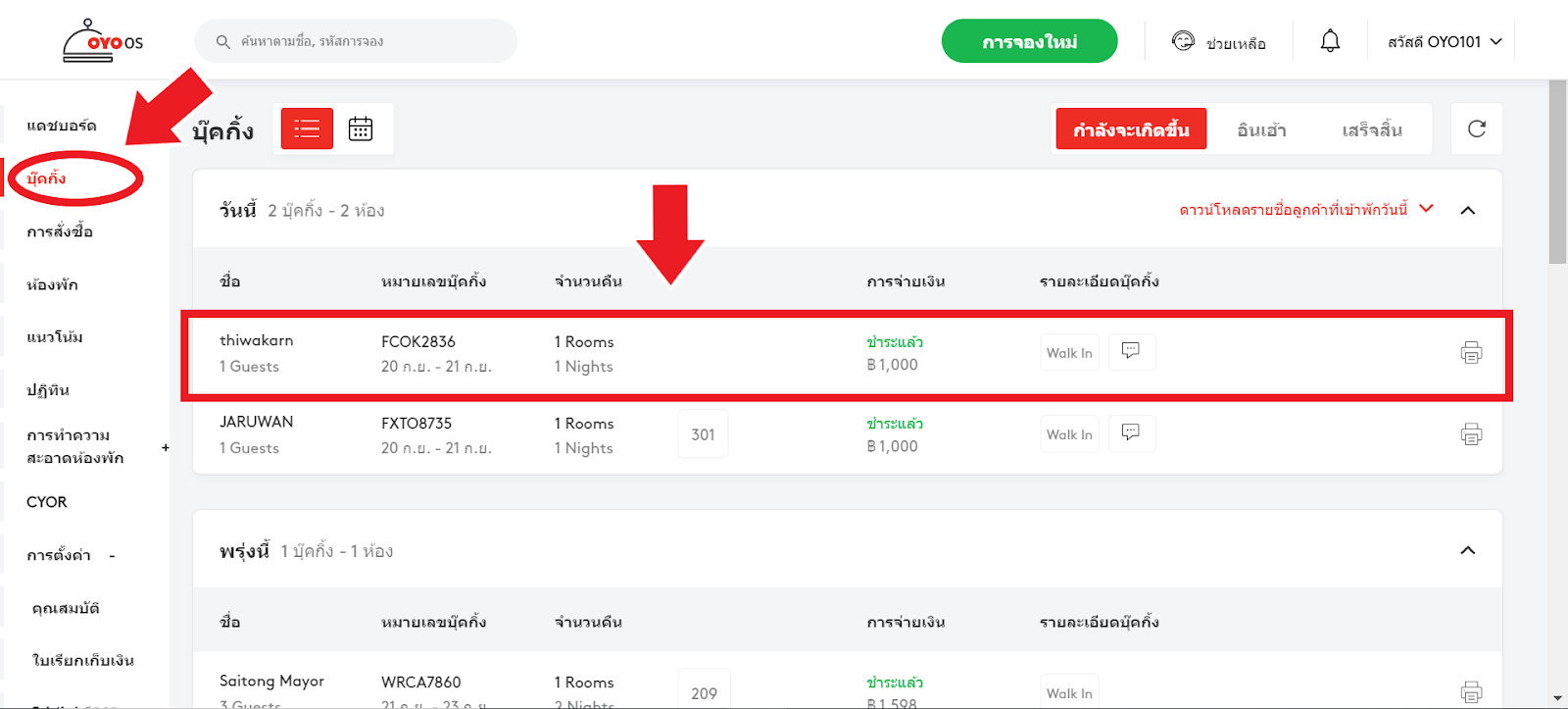ขั้นตอนที่ 1: ในแท็บ การจอง ให้คลิกที่การจองที่คุณต้องการเพิ่มบิล