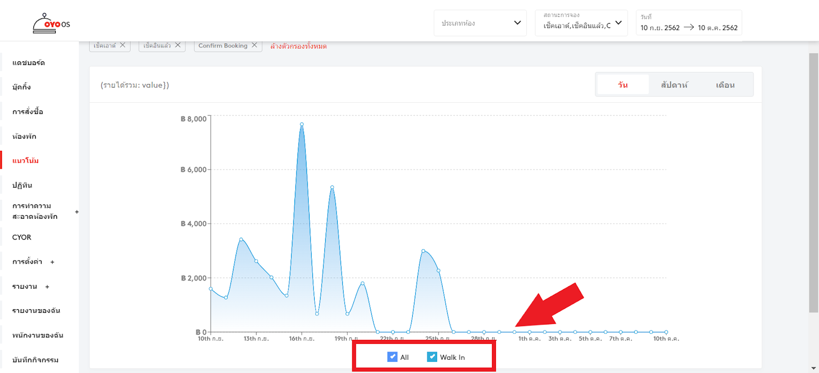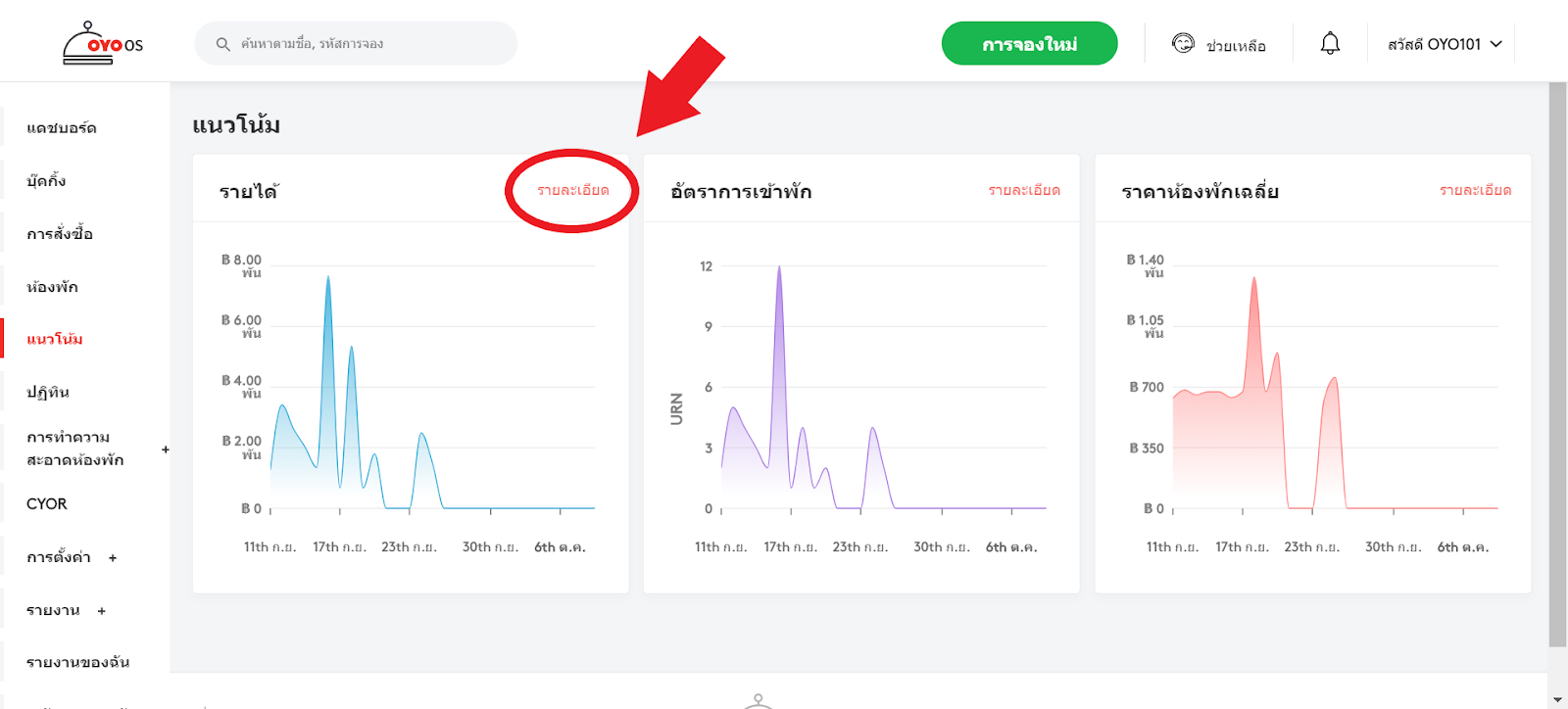 ผู้จัดการโรงแรม (Property Manager) สามารถวิเคราะห์รายได้ (Revenue) อัตราการเข้าพัก (Occupancy) และราคาห้องพักเฉลี่ย (Average Room Rate) ในรูปแบบของกราฟบน OYO OS ฟีเจอร์นี้จะทำให้เห็นภาพรวมเมตริกของธุรกิจได้อย่างชัดเจนขึ้น