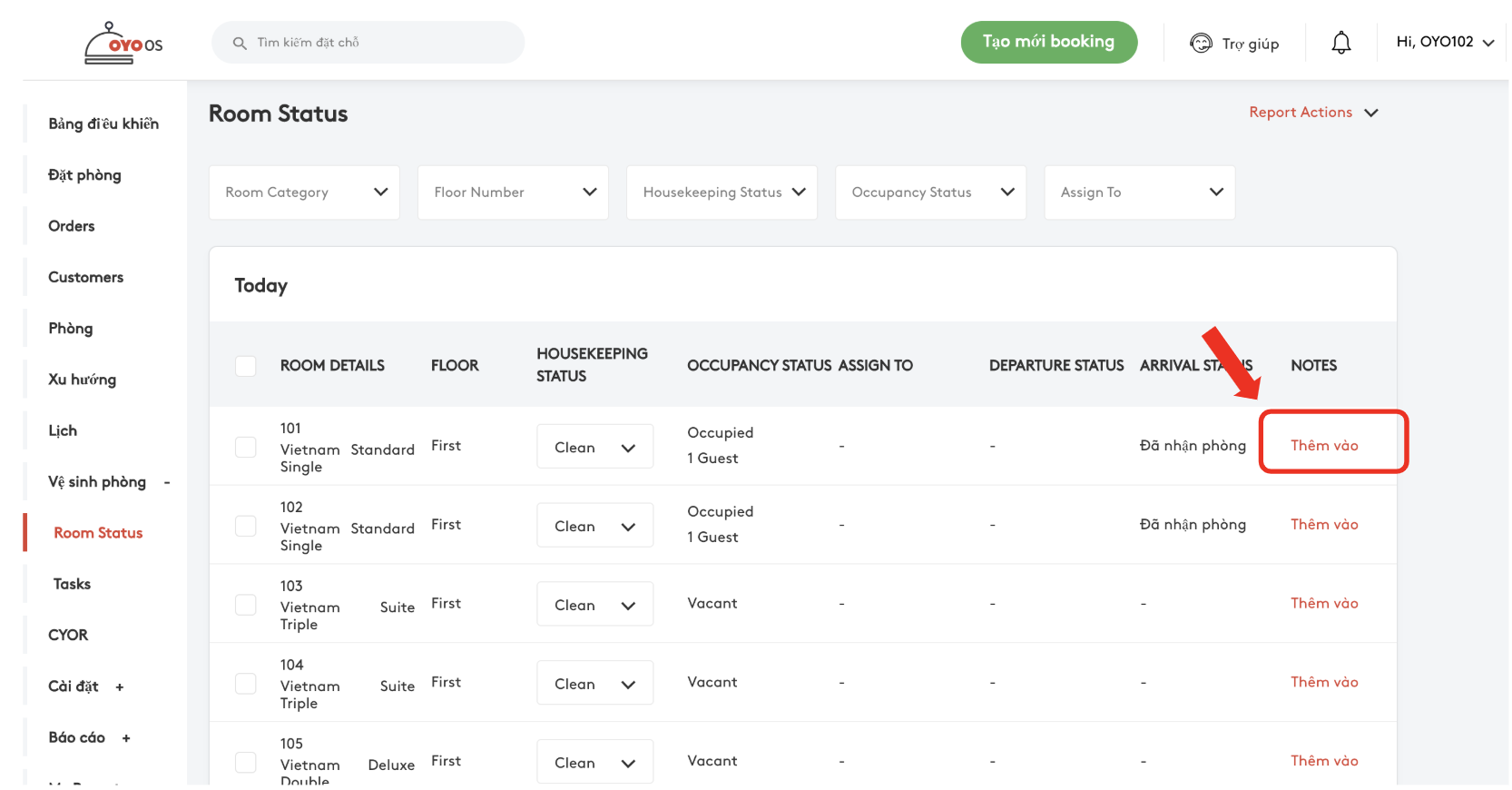 BƯỚC 2: Sau khi nhấp vào Vệ sinh, 2 thẻ mở rộng sẽ được hiện ra, Tình trạng phòng (Room Status) và Nhiệm vụ (Task), nhấp vào Tình trạng phòng (Room Status)
