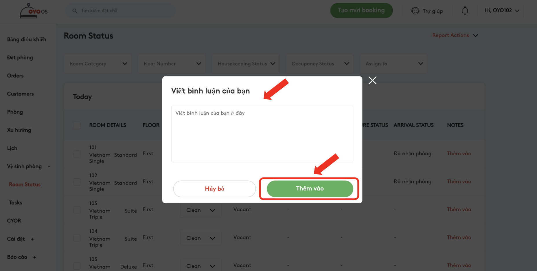 Các bước để thêm bình luận liên quan đến vệ sinh phòng cho một phòng của khách sạn: