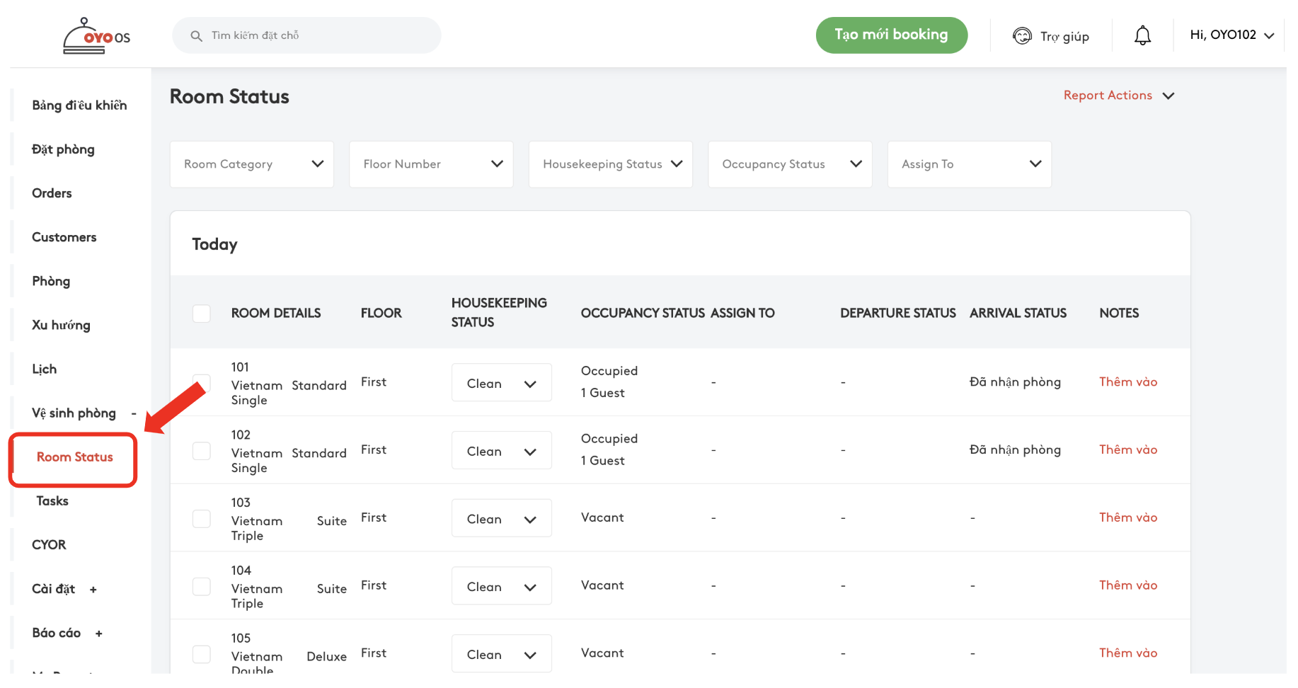 BƯỚC 3: Dưới mục Tình trạng vệ sinh (Housekeeping Status), nhấp vào menu thả xuống và chọn tình trạng của phòng